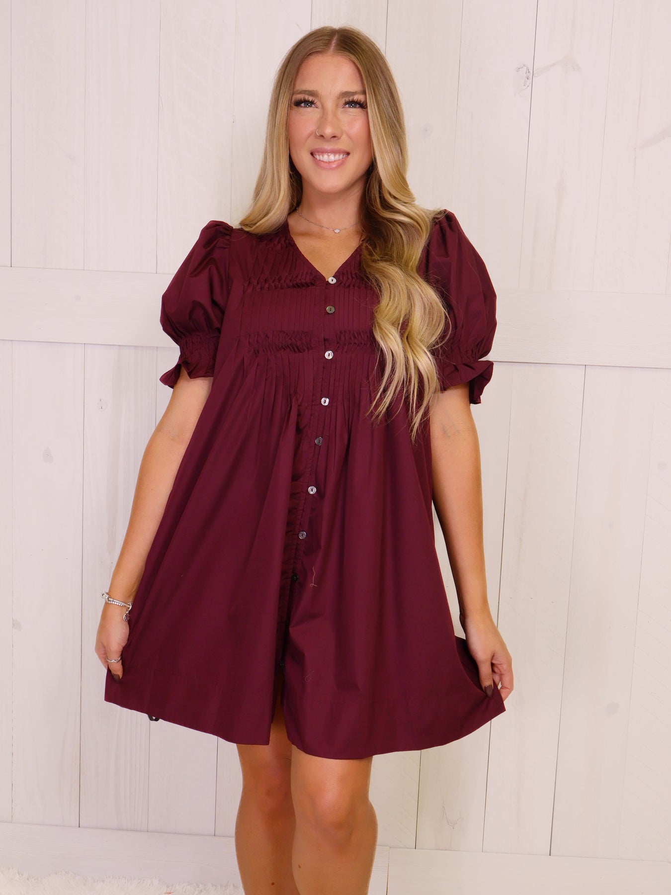 This Entro Wine Button Down Smocked Neck Dress is the perfect addition to any wardrobe. Made with high quality fabric and expert craftsmanship, this dress offers both style and comfort. With its classic design and versatile button down feature, it can easily be dressed up or down for any occasion. Stay on trend and showcase your sophisticated taste with this must-have dress.