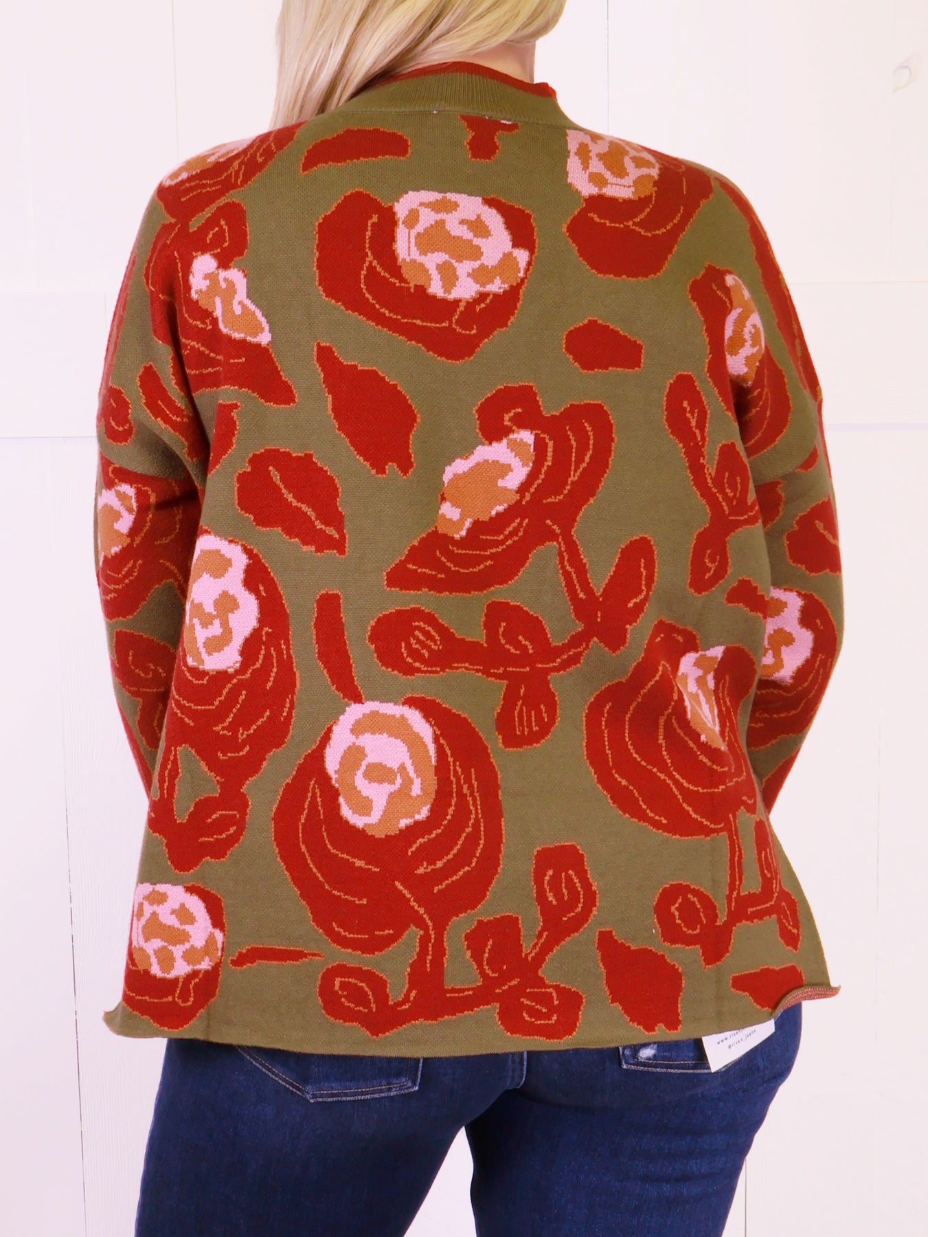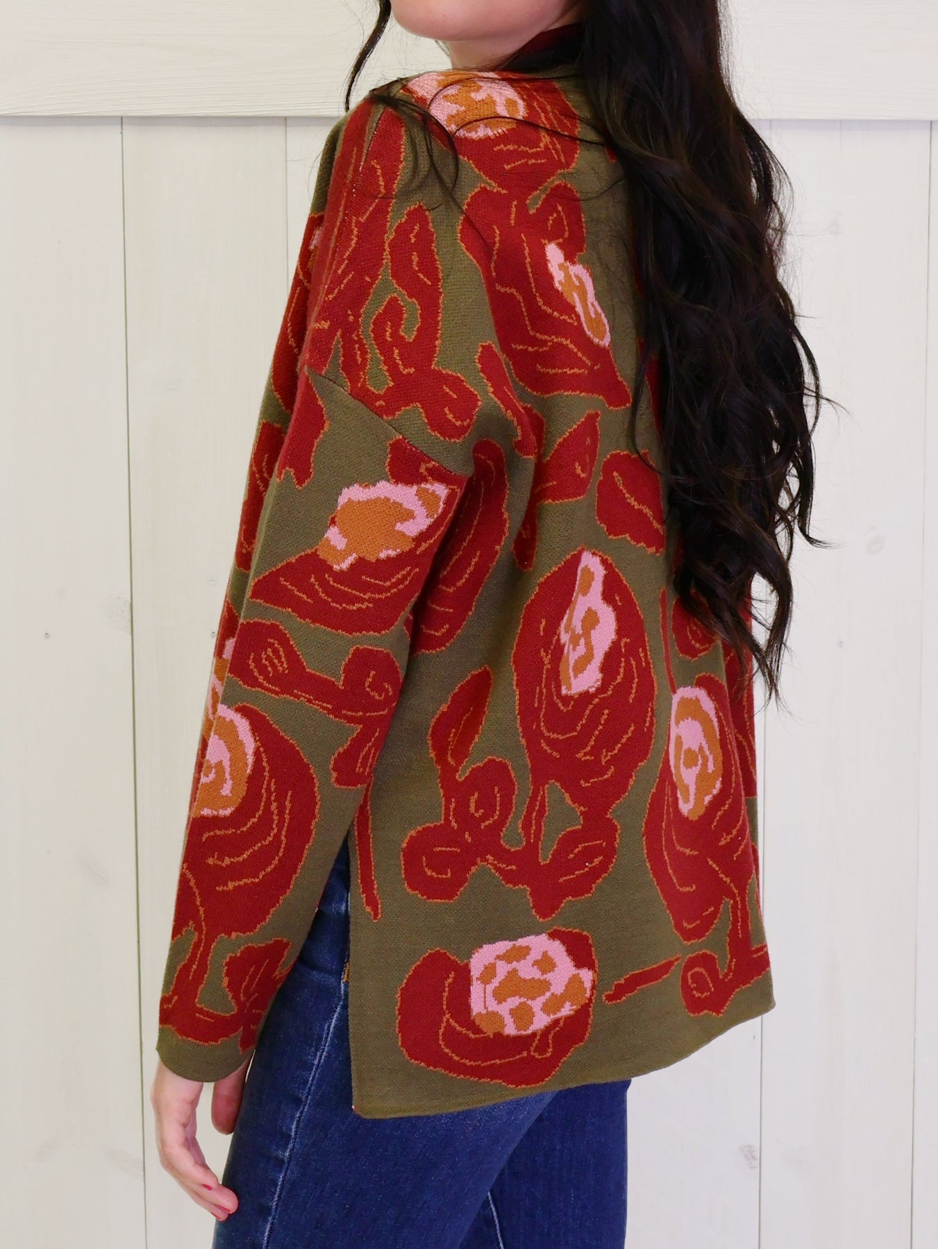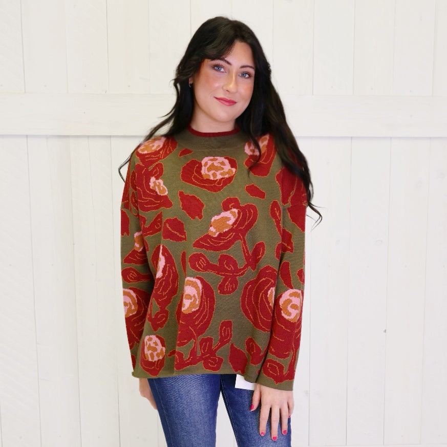 This olive mock neck sweater with a beautiful rose print is a versatile and stylish addition to any wardrobe. The soft and comfortable fabric will keep you warm and cozy, while the mock neck adds a touch of sophistication. Perfect for chilly days and easy to dress up or down.