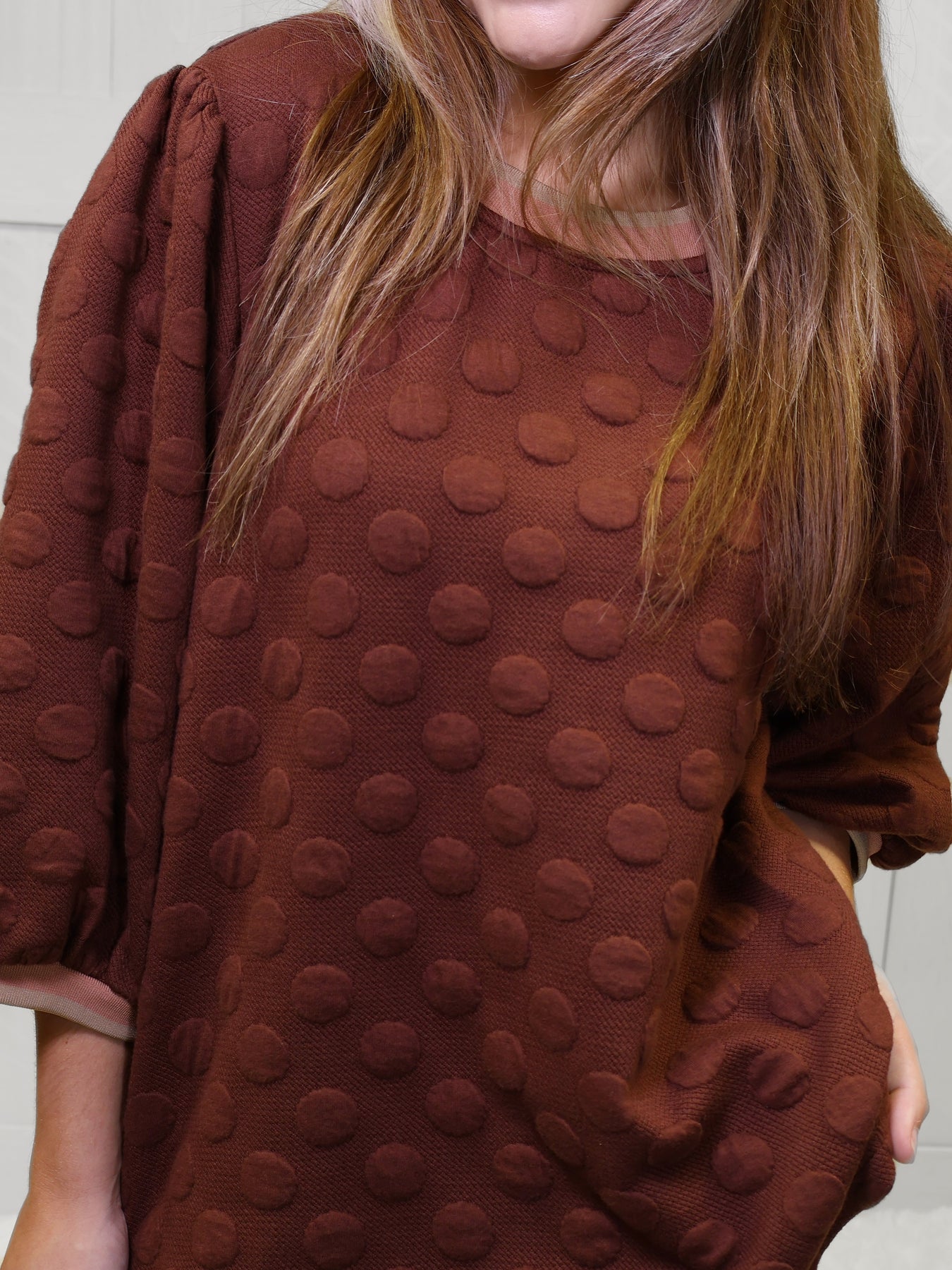 Elevate your style with the Umgee Brown Polka Dot Top. The sleek stripe band detail adds a touch of sophistication, making this top perfect for any occasion. Feel confident and chic in this must-have piece.