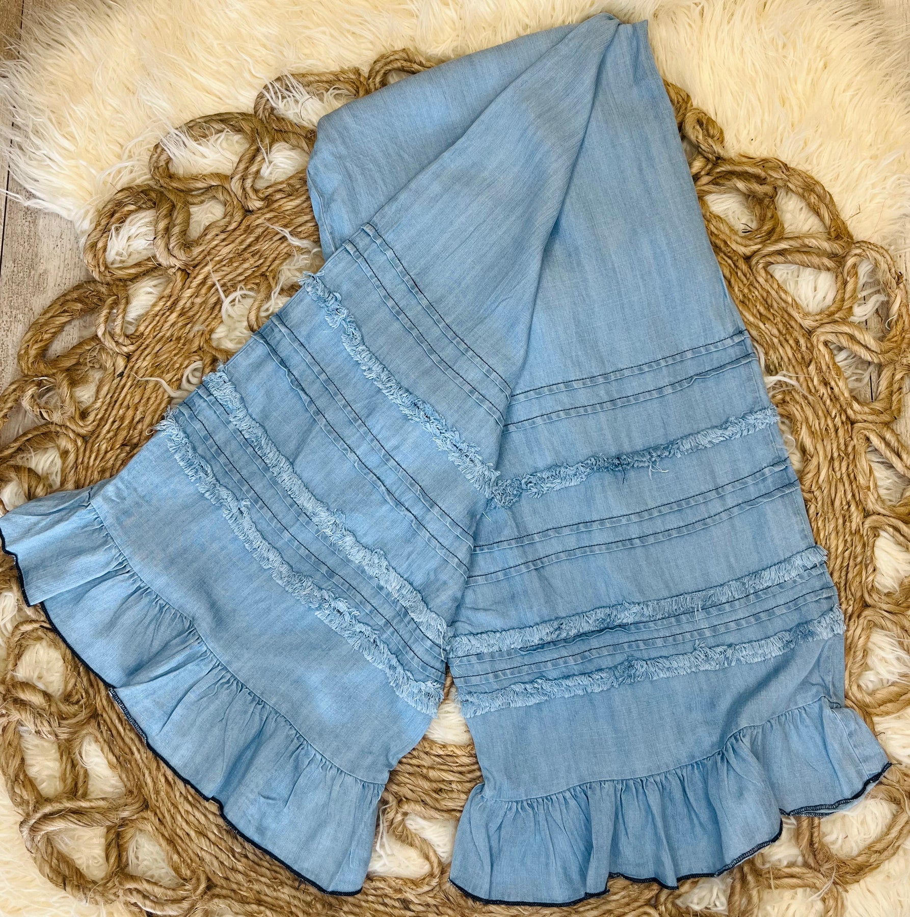 Introducing our new Easel Light Denim Ruffle Pants. Made with cozy, flowy ruffle linen, these pants are perfect for the fall season. The light denim color adds a touch of elegance to your look. Say hello to your new go-to pants for any occasion.