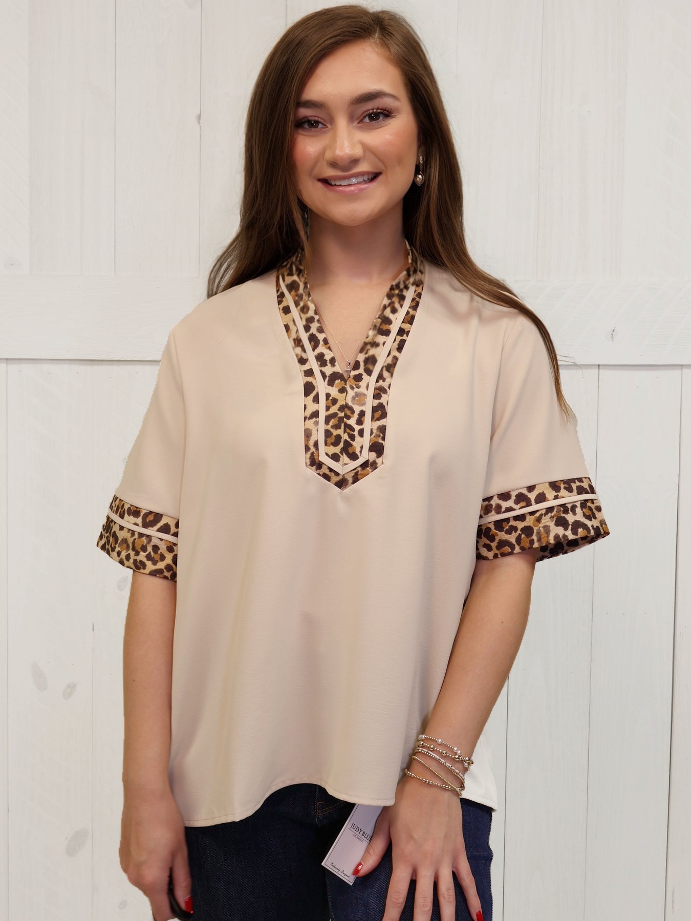 This top from Entro features a trendy cream color with stylish cheetah accents. Made for women, it offers a unique, fashion-forward look that is perfect for any occasion. Made with high-quality materials, this top is both comfortable and stylish, making it a must-have for any wardrobe.