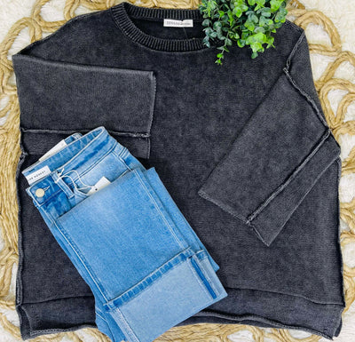 Black Acid Wash Exposed Seam Sweater Top Pullover