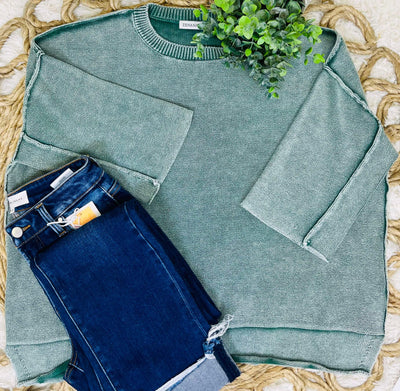 Dark Green Acid Wash Exposed Seam Sweater Pullover Top