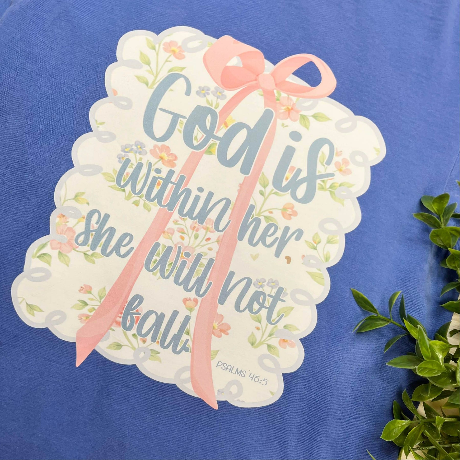 The Psalms 46:5 Blue Graphic Tee is designed with a floral motif and a pink bow, combining aesthetic appeal with a meaningful scriptural reference. Crafted from high-quality materials, it offers comfort and durability, making it suitable for everyday wear while promoting a sense of peace and faith.
