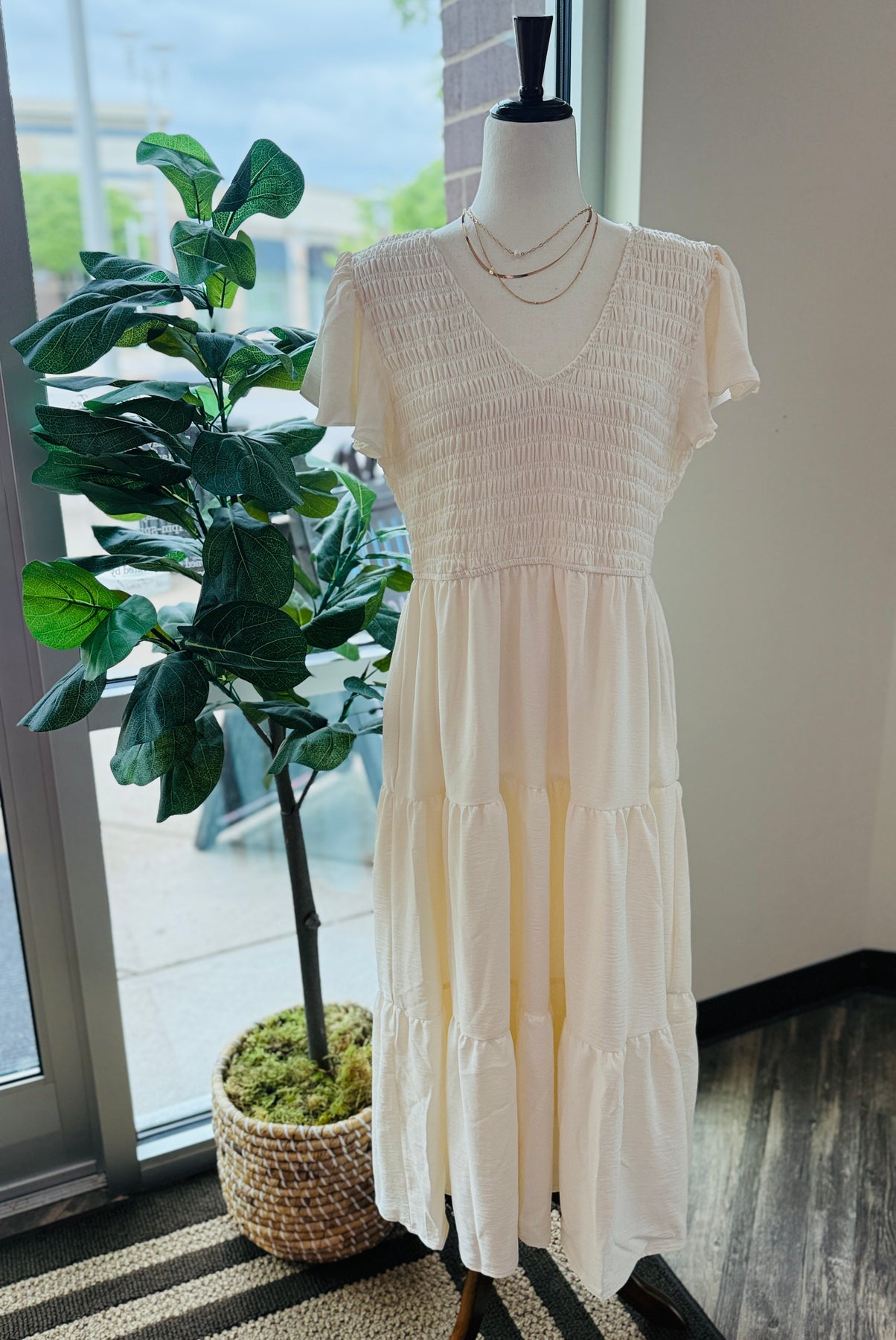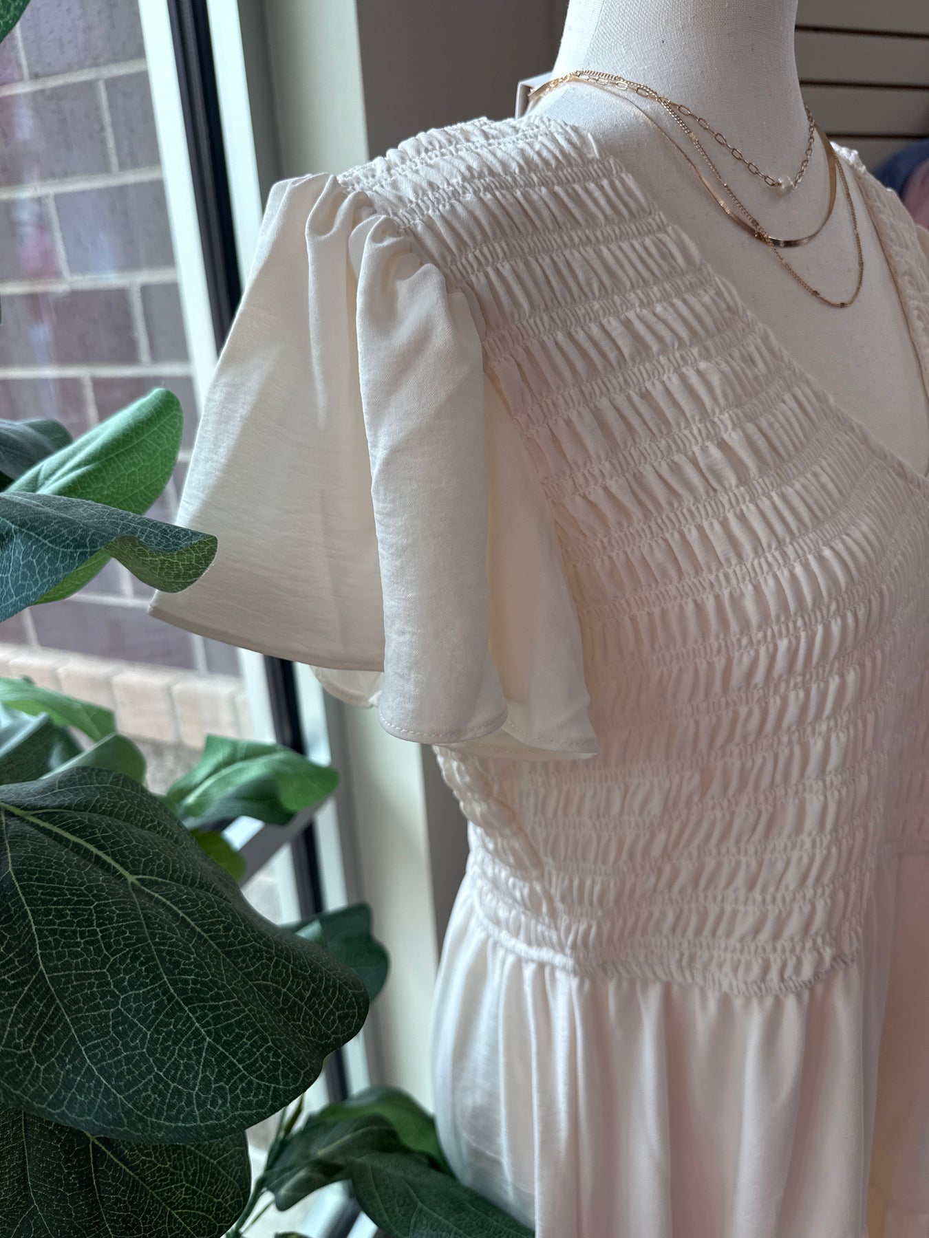 This Ivory Smocked Midi Dress exudes effortless elegance with its smocked design. Made with high-quality fabric, it hugs your curves and flatters your figure, making it a versatile piece for any occasion. Look and feel confident and chic in this timeless dress.