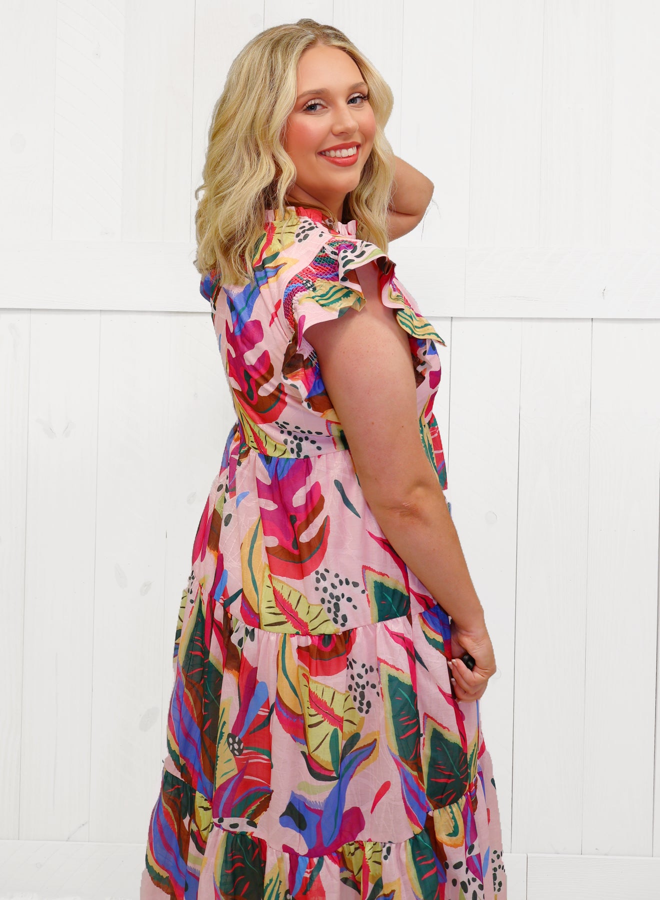 The Jodifl Take me on Vacay Dress in blue tropical pattern is sure to make a statement on your next vacation. With its long and flowy design, you'll stay cool and stylish while exploring new destinations. Perfect for any tropical getaway.