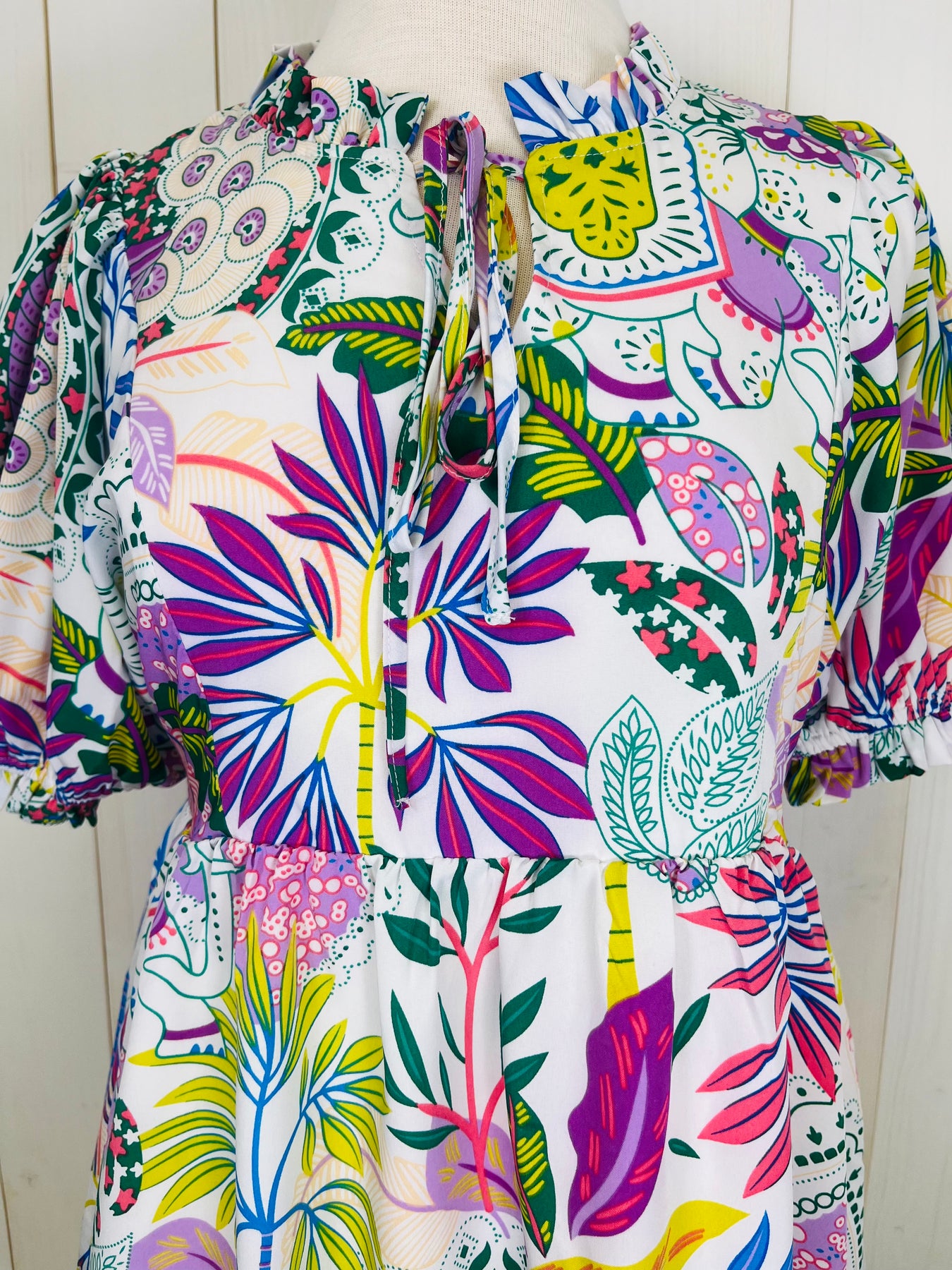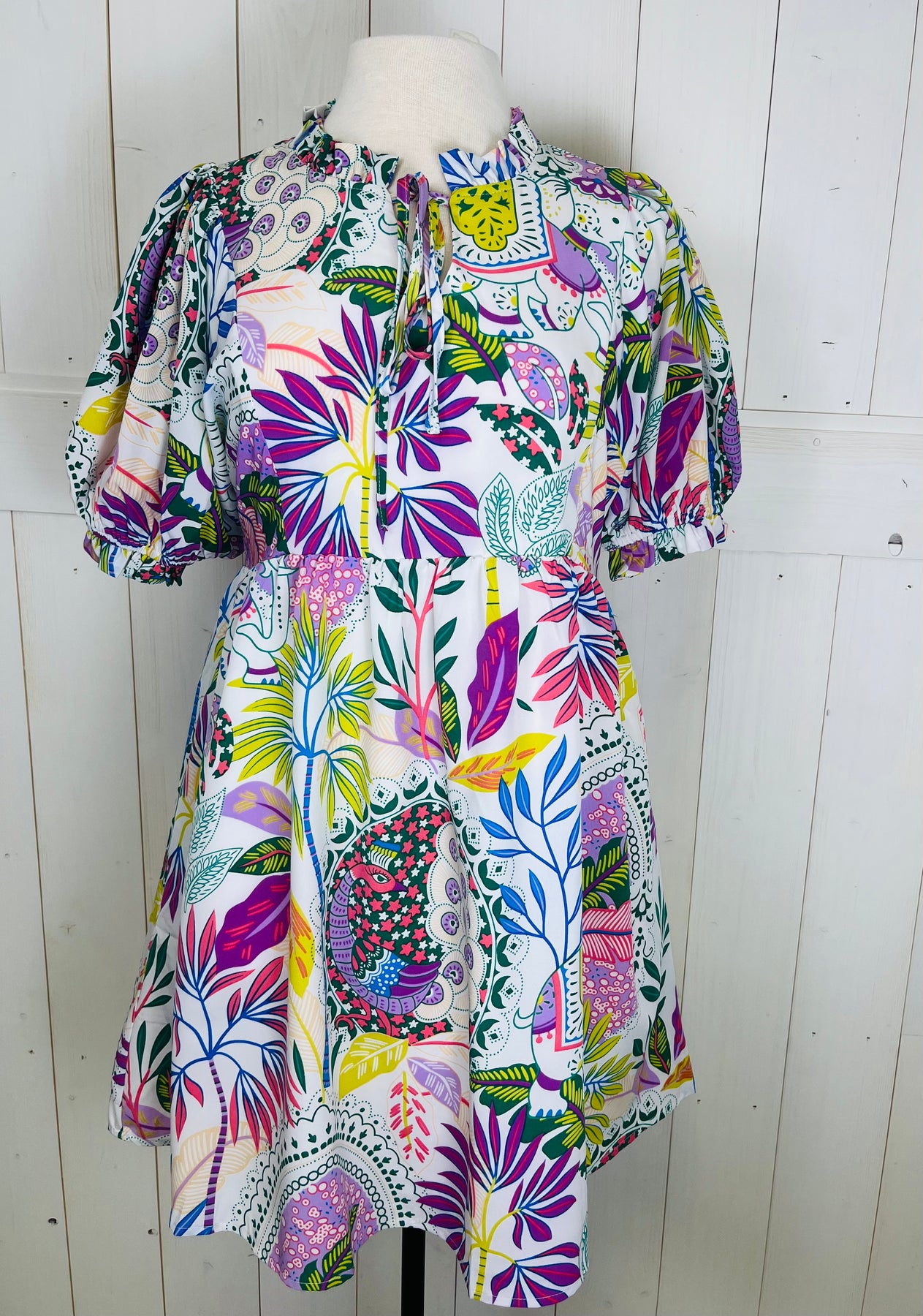 Effortlessly blend comfort and style with the JODIFL Tropical Dress. With a vibrant elephant peacock print, this flowy dress is perfect for any tropical occasion. Its cute design and breezy fit make it the perfect choice for all-day wear. Elevate your wardrobe with this must-have dress.