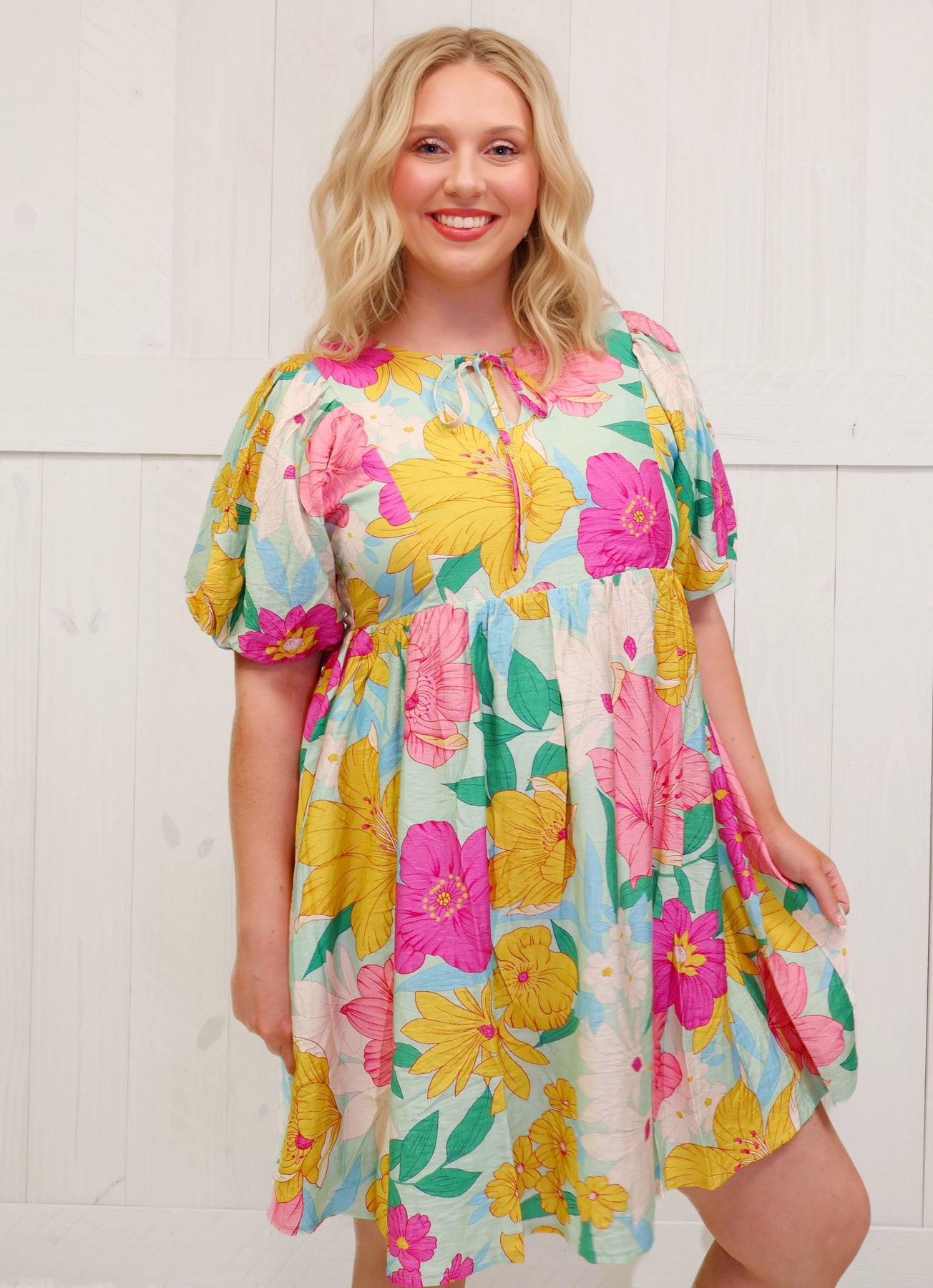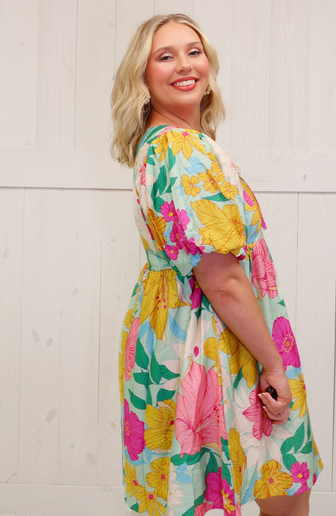 This mint floral dress is a must-have for any fashion-forward individual. Its refreshing color and delicate floral pattern will make any woman stand out in a crowd. Made with high-quality fabric, this dress is comfortable and stylish. Perfect for any occasion, from a casual day out to a formal event.