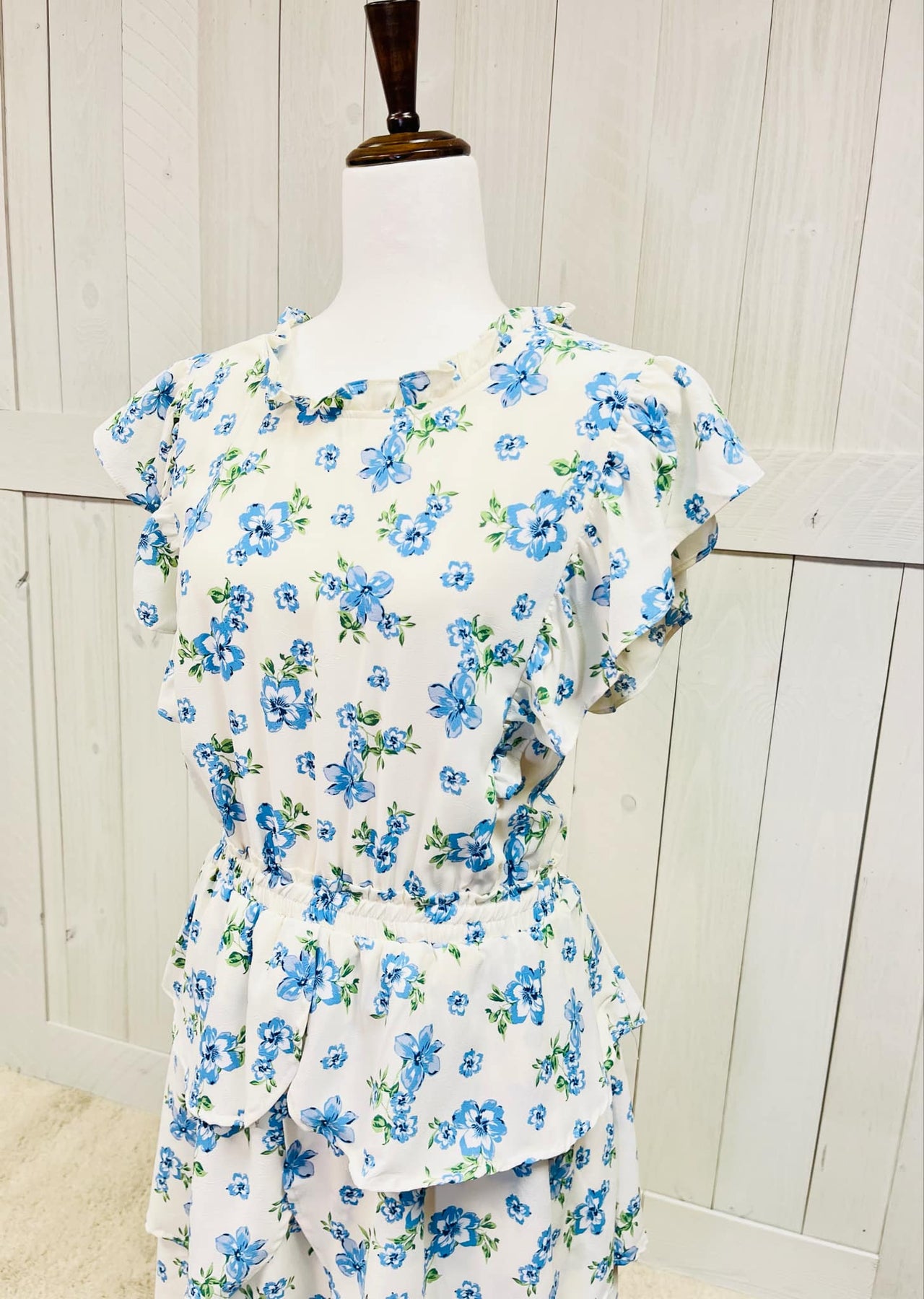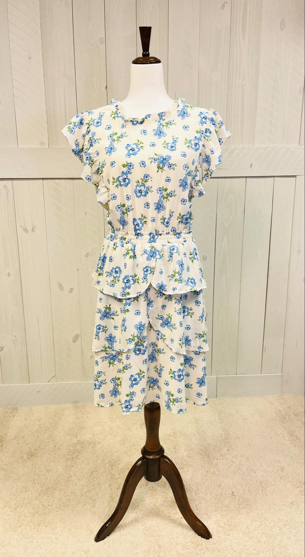 This women's dress features a white base with a delicate blue floral pattern. Flattering and elegant, this dress is perfect for any occasion. The high-quality fabric and beautiful design will make you stand out in any crowd. Transform your wardrobe with this versatile and timeless piece.