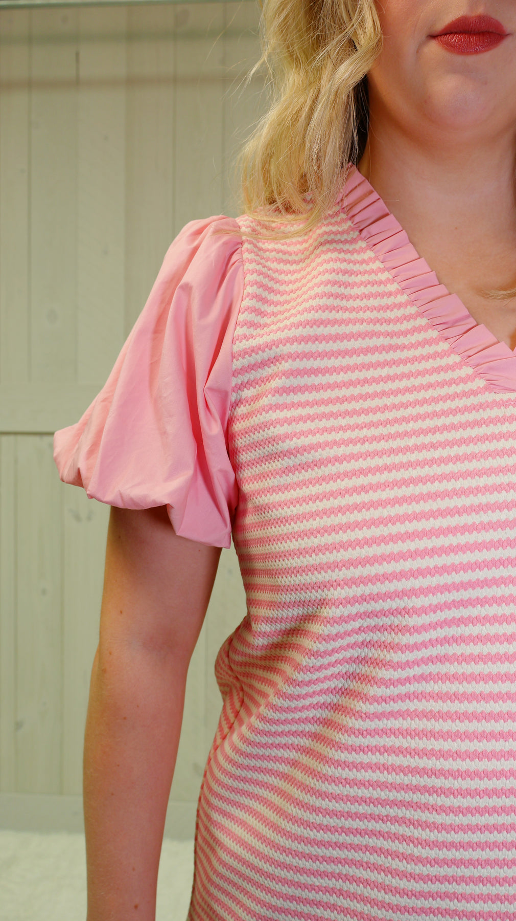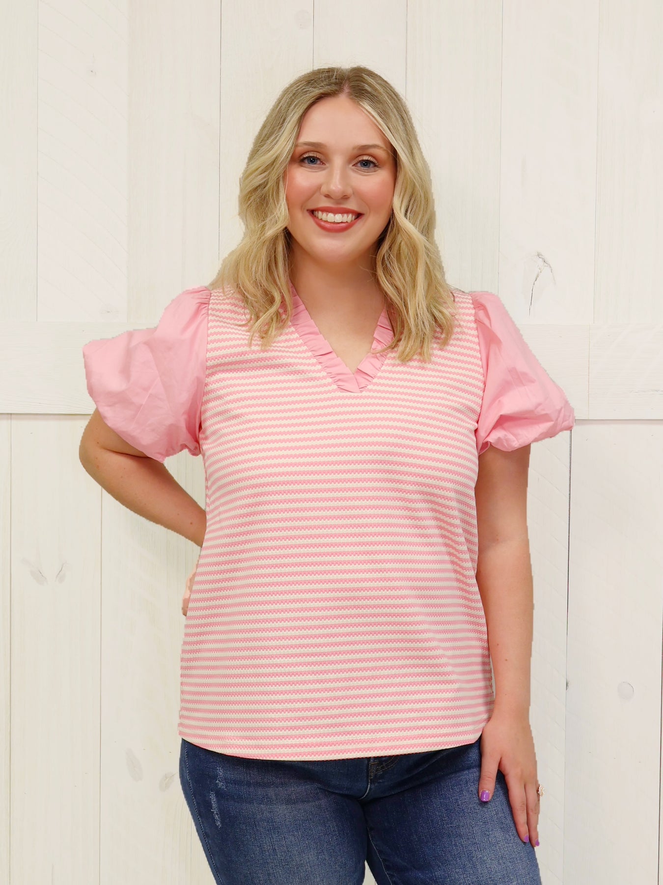 "Upgrade your wardrobe with our Candy Pink Strip Puff Sleeve Top. This trendy top features adorable puff sleeves, adding a touch of feminine charm to any outfit. Made of high-quality material, this top offers both style and comfort. Perfect for any occasion, this top is a must-have for any fashion-forward individual."