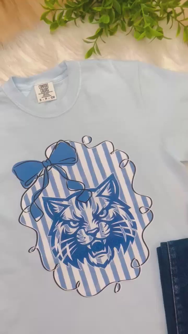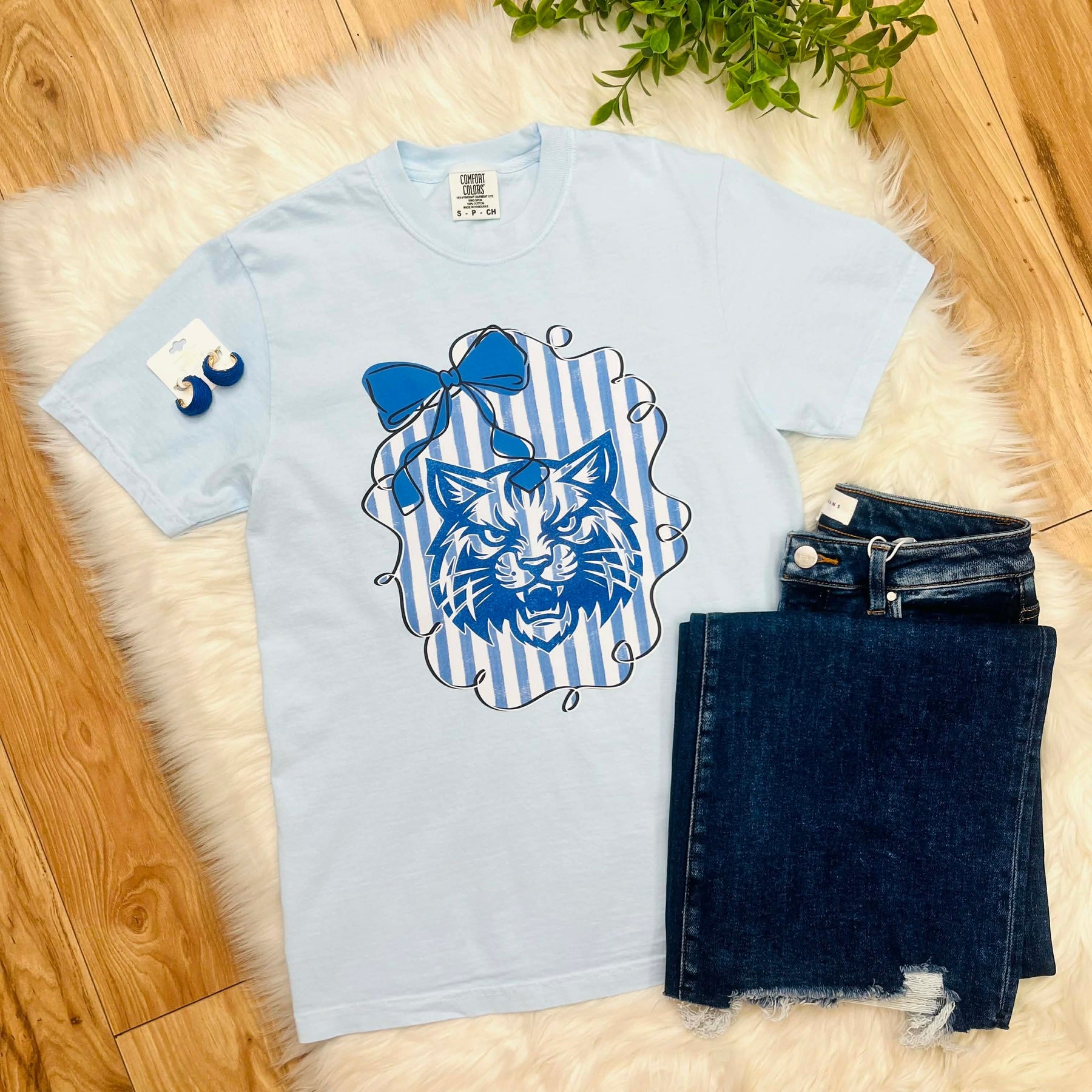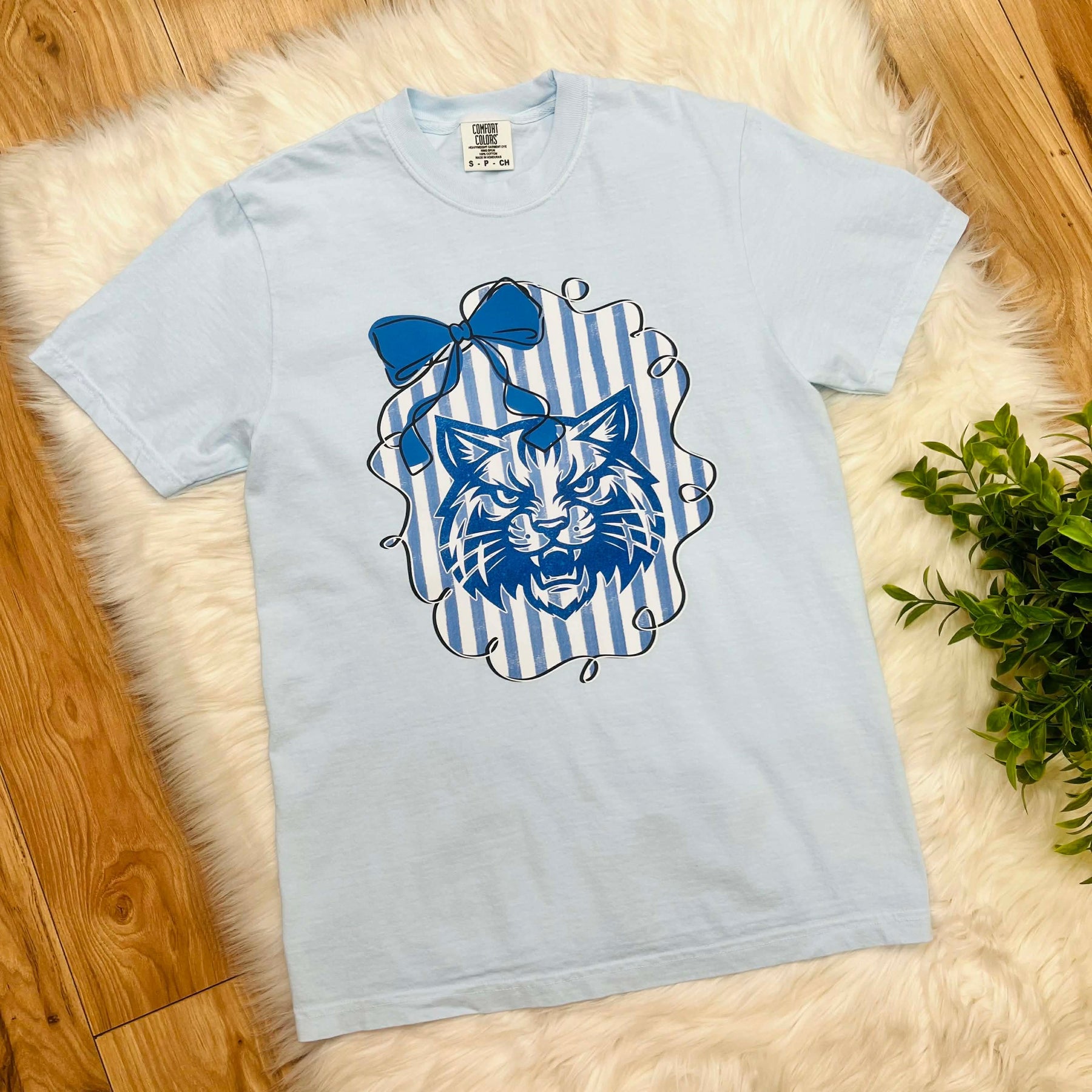 The Blue Wildcat Graphic Tee features a striking wildcat design complemented by a subtle stripe background. This tee is crafted for durability and comfort, making it suitable for both casual and active wear.