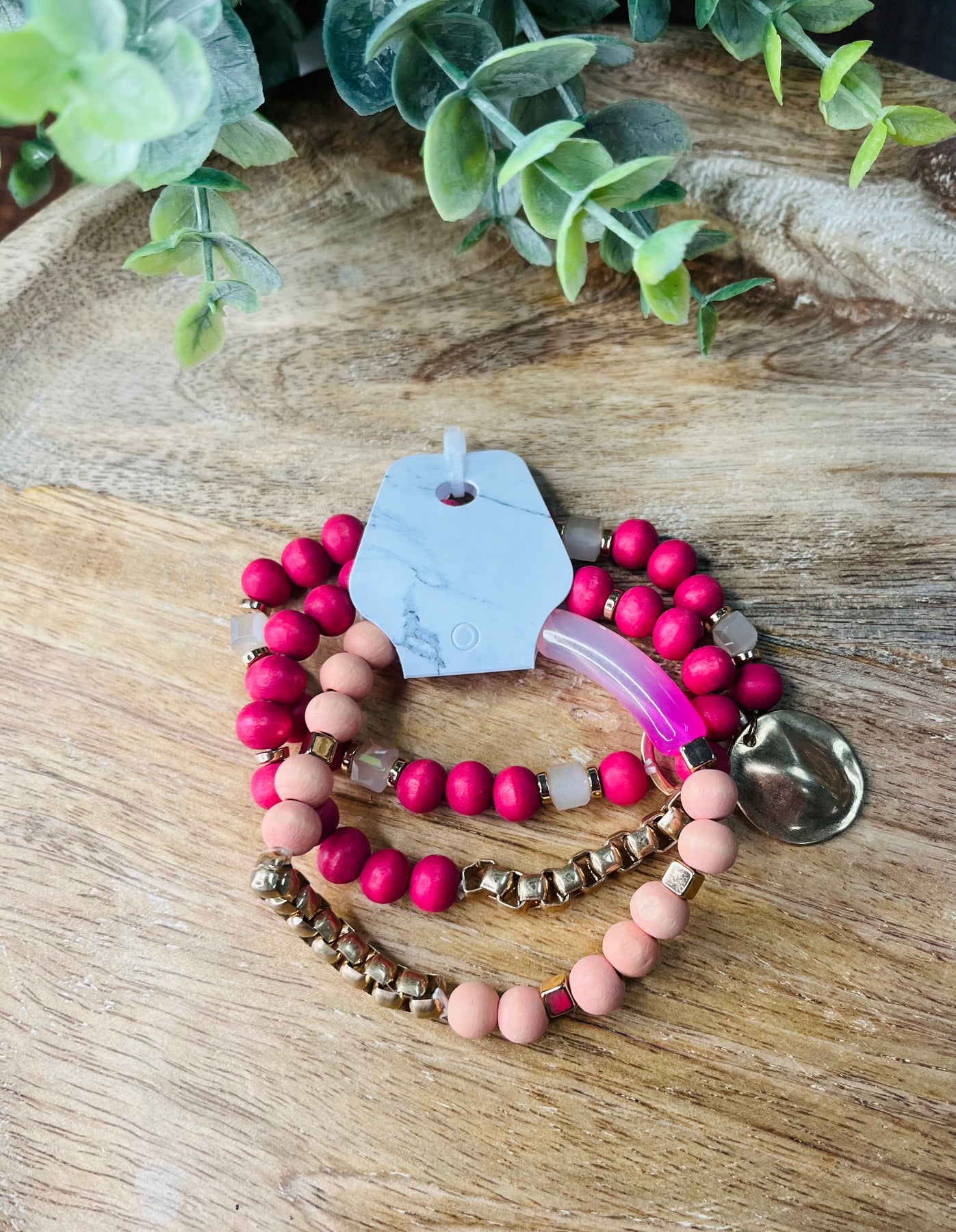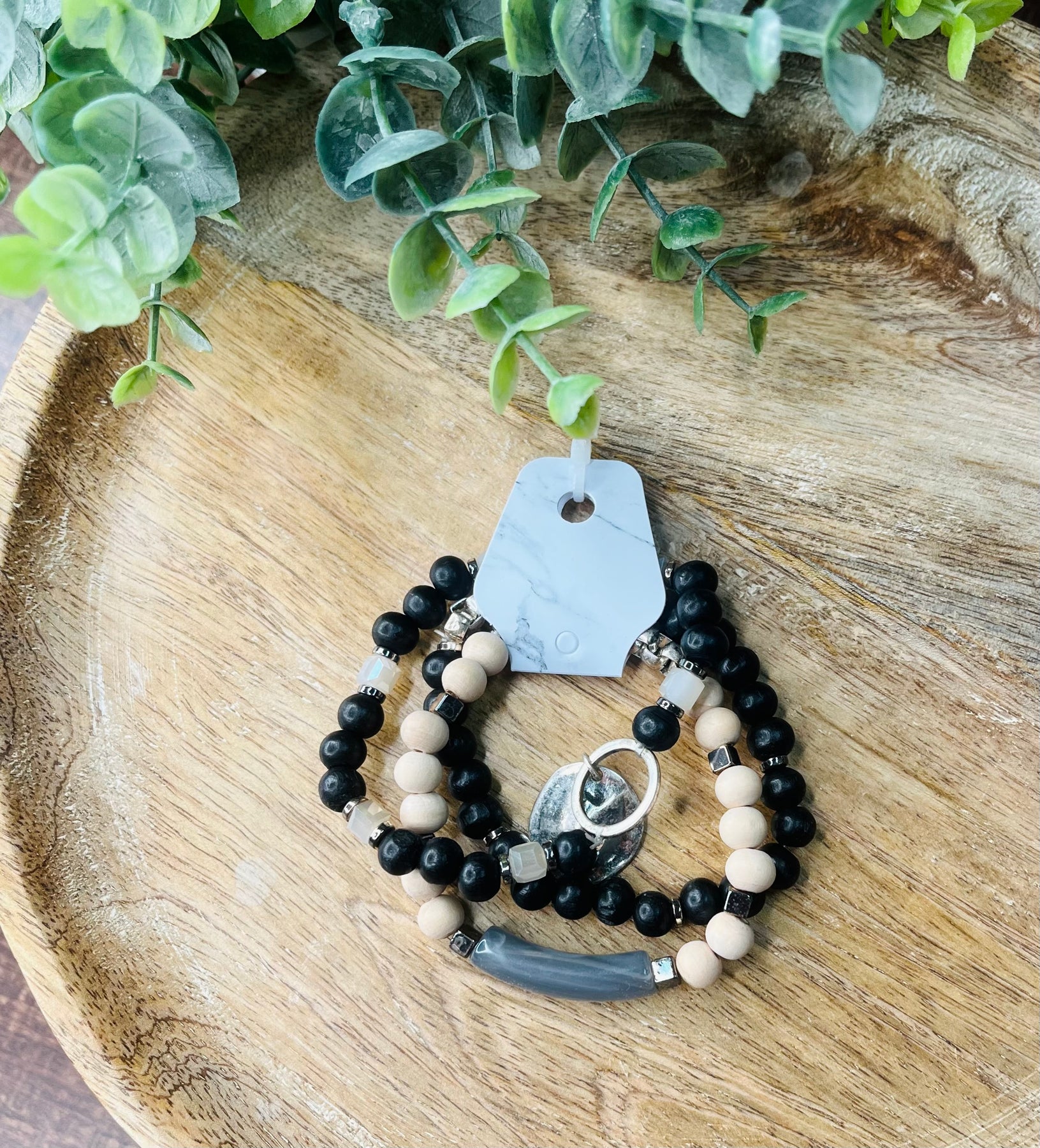 This stylish and versatile bracelet features clay beads and a delicate circle charm. The clay beads add a unique touch and the circle charm adds a touch of elegance. Perfect for adding a pop of color and sophistication to any outfit. AW