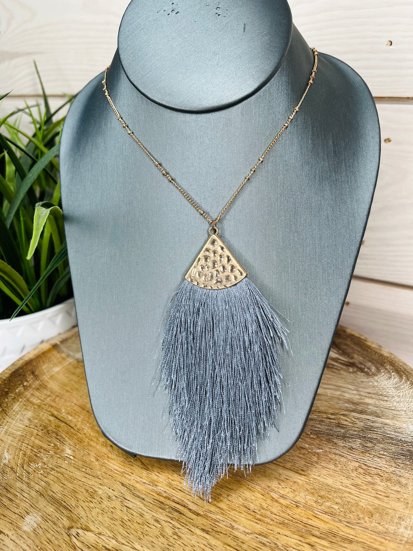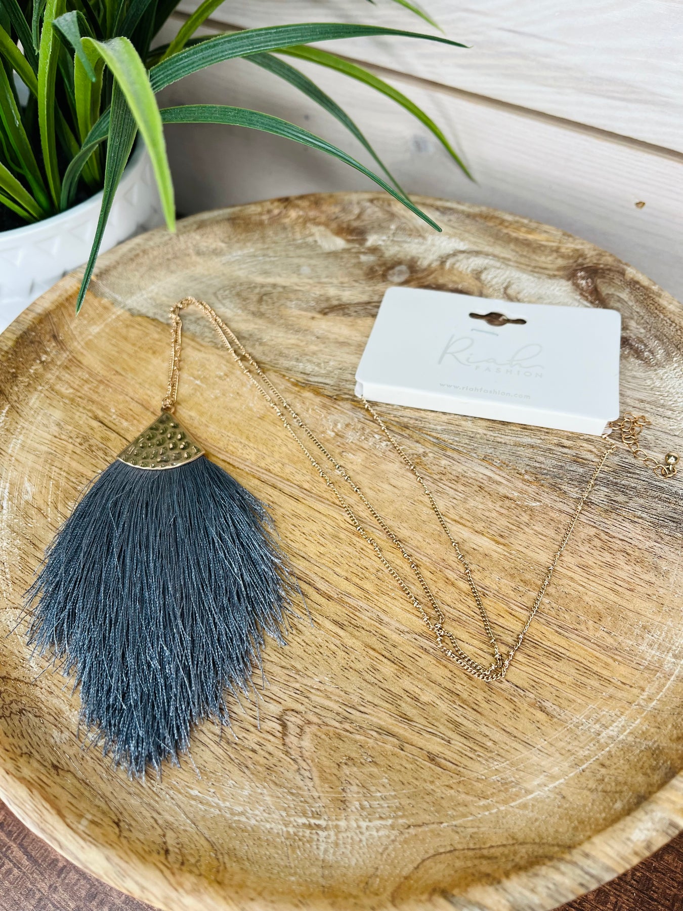 This elegant gold fringe necklace is a must-have addition to any outfit. Its intricate design and high-quality material make it a versatile piece that can be dressed up or down for any occasion. With its timeless charm and refined style, this necklace is sure to elevate your look and make you stand out from the crowd. KN