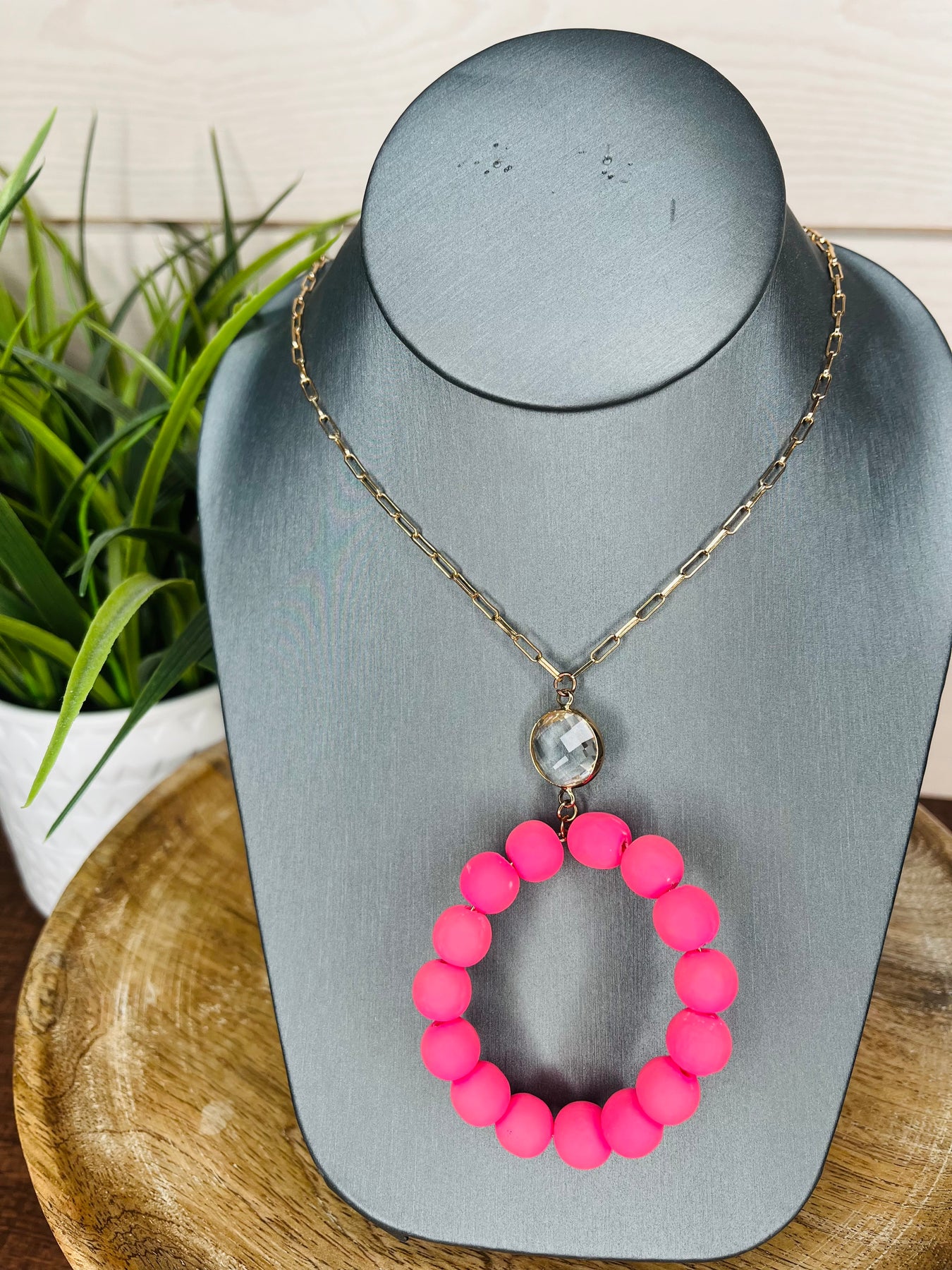 This elegant set includes a stunning pink oval bead necklace (belly button length) and matching gold studs. Crafted with high-quality materials, this jewelry is perfect for adding a touch of sophistication to any outfit. The delicate oval beads add a subtle pop of color, while the gold studs add a timeless touch of elegance. Perfect for any occasion, this set is sure to elevate your style. KN