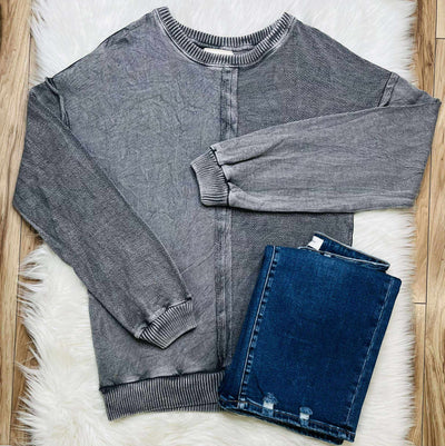 Zenana Basic Acid Wash Terry Exposed Seam Sweater Pullover Ash Black