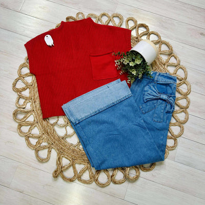 Women’s Basic Red Mock Neck Pocket Sweater