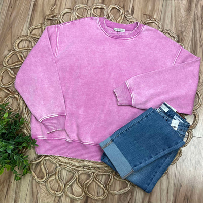 Zenana Basic Acid Wash Terry Exposed Seam Sweater Pullover Pink