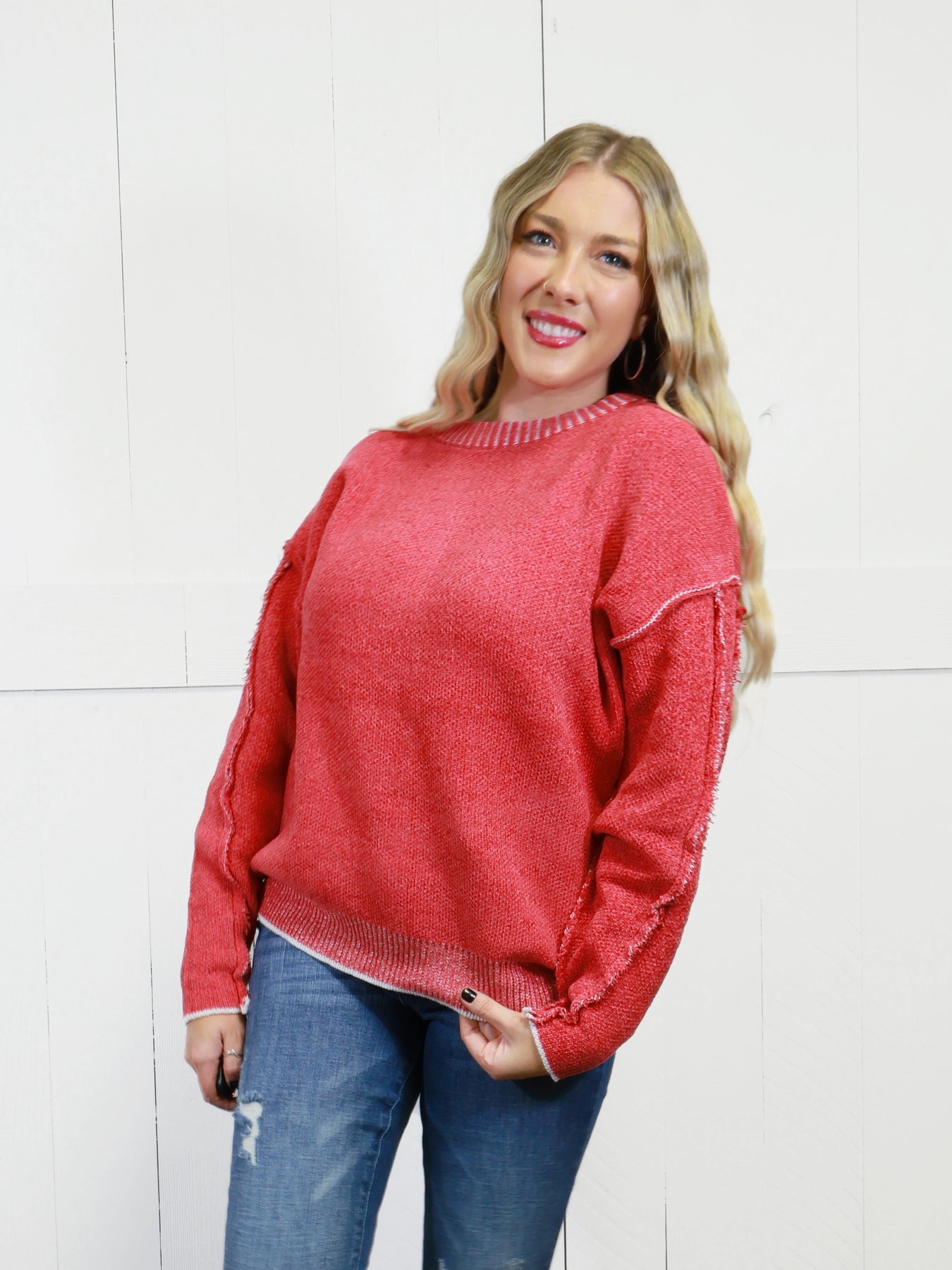 Women’s Basic Zenana Exposed Seam Round Neck Sweater Dark Red Pullover