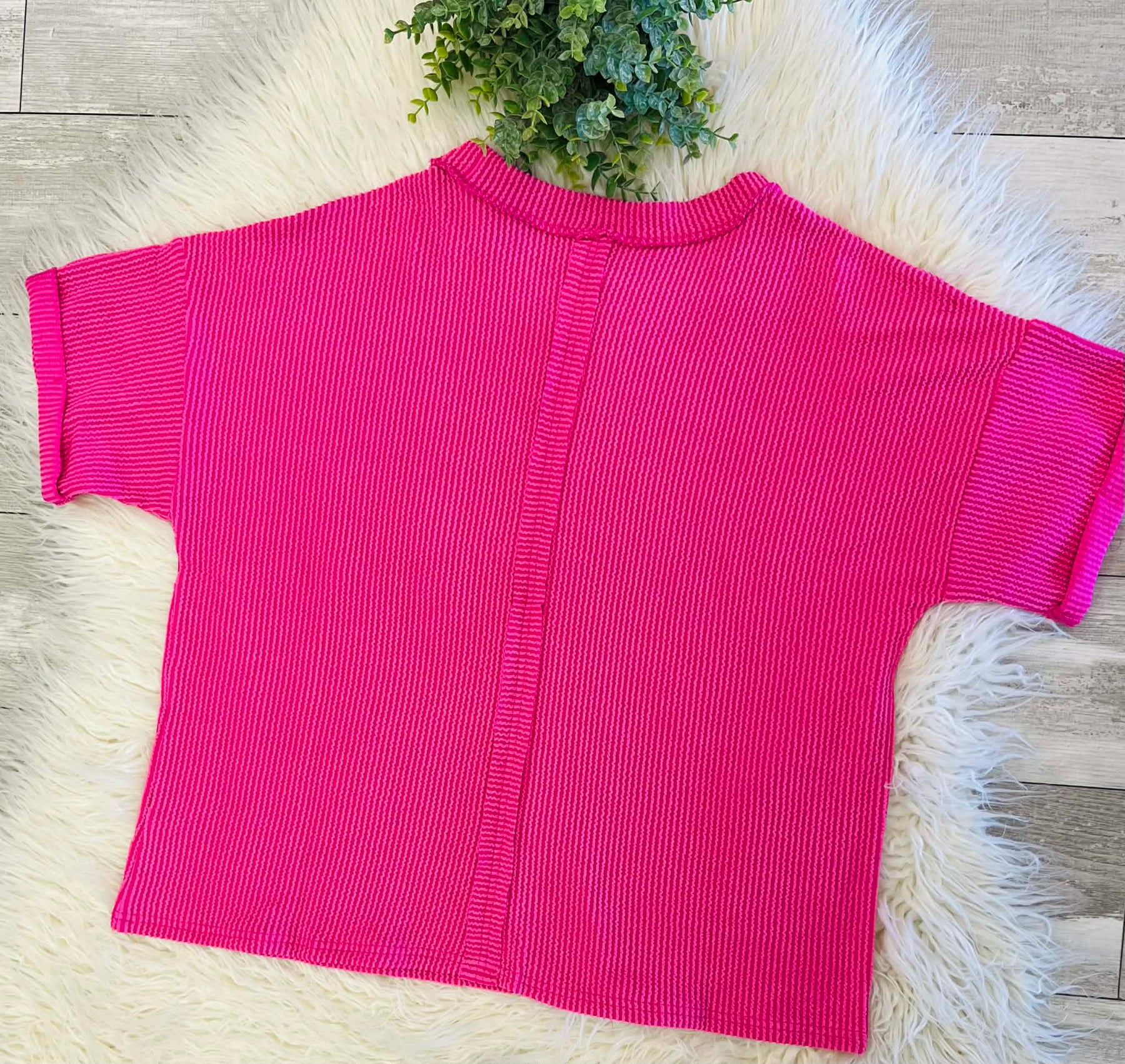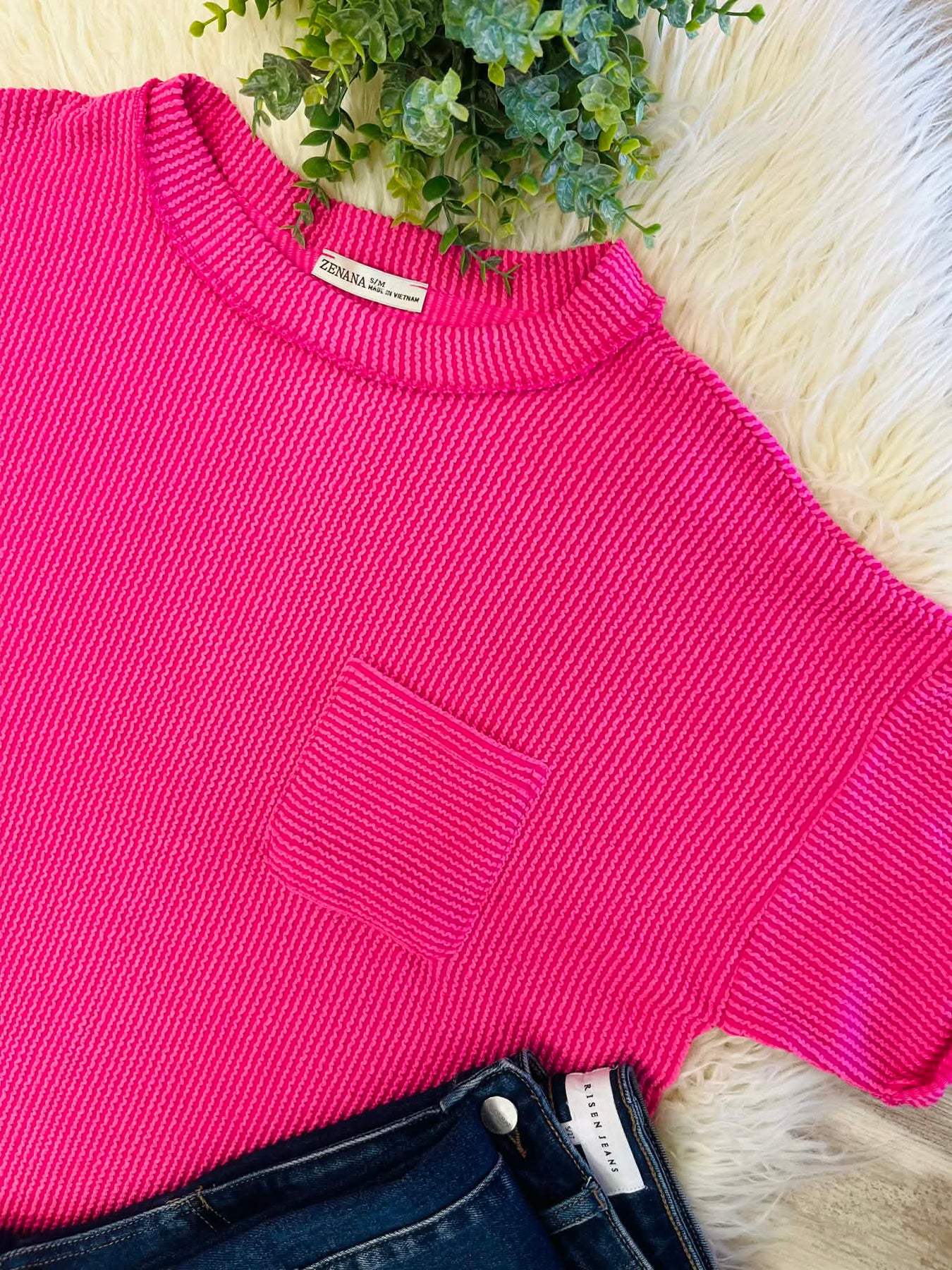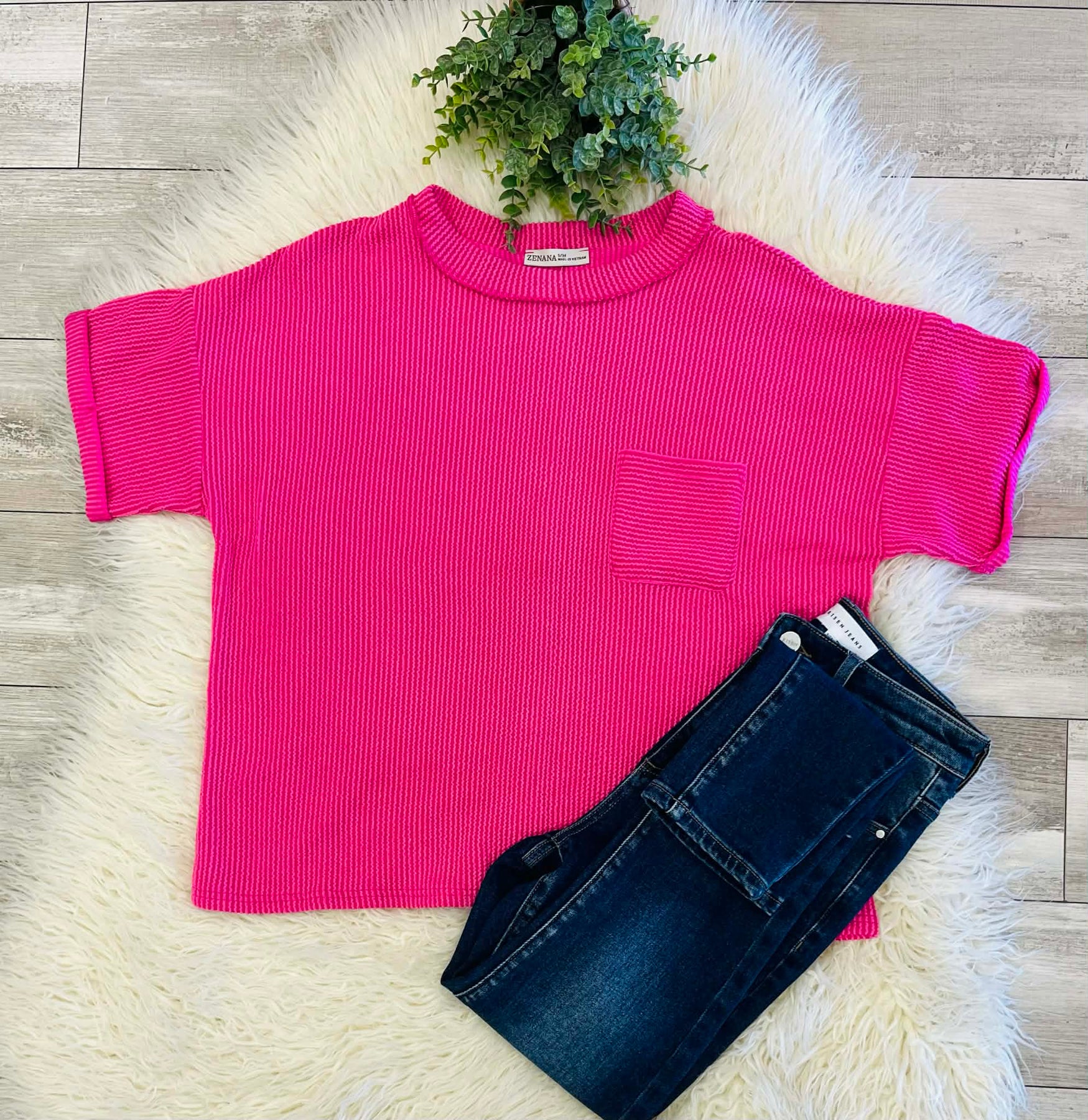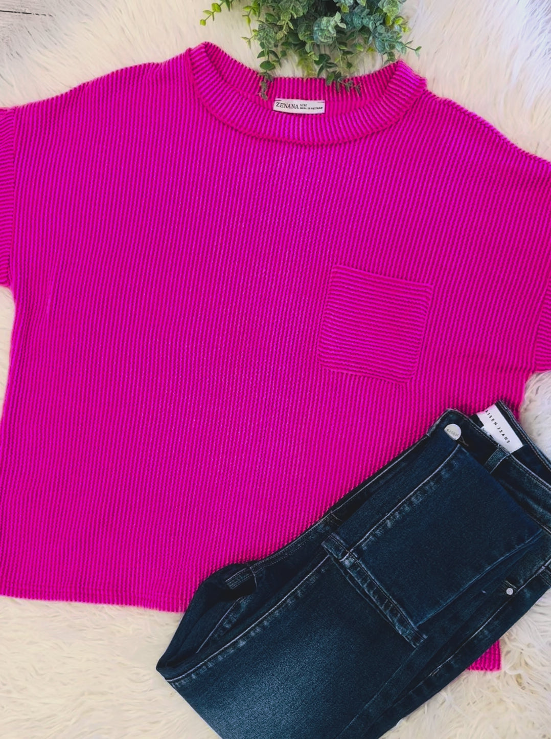 The Zenana Ribbed Pocket Top features a practical design with a ribbed texture and a prominent pink pocket. This combination enhances both comfort and style, offering a versatile wardrobe option that can be paired easily. The ribbed fabric adds structural integrity, ensuring durability while maintaining a soft touch.