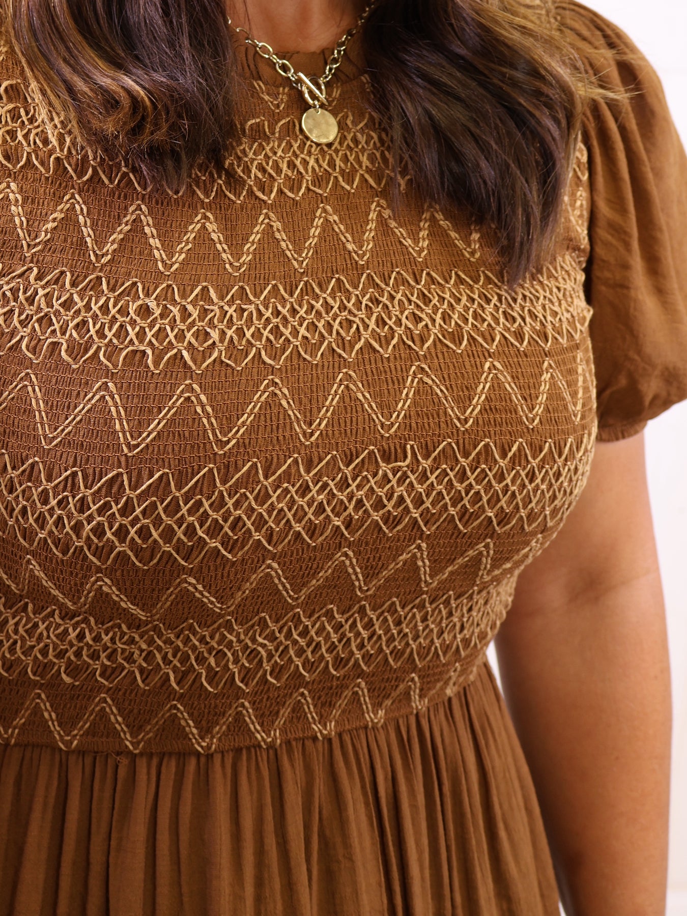 This Camel smocked dress features contrast stitching for a unique and sophisticated look. Made from quality fabric, it offers a comfortable and stylish fit. Perfect for any occasion, this dress is a must-have addition to your wardrobe. Elevate your style with this elegant and versatile piece.