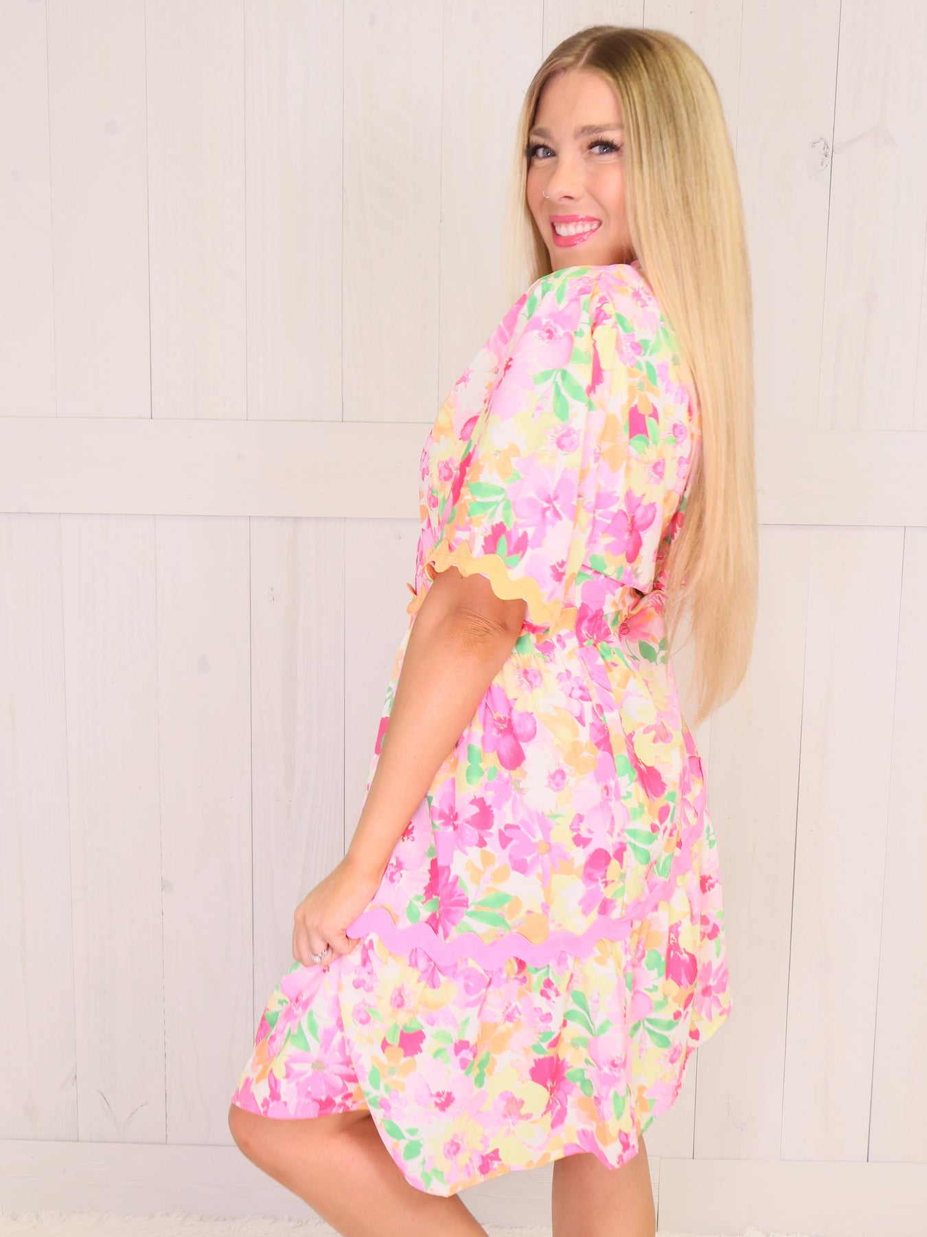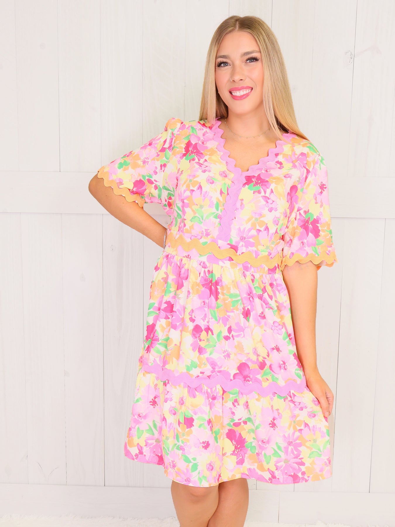 Expertly designed for curvy figures, our Curvy Floral Bloom Dress is a must-have addition to your wardrobe. The classic floral print adds a touch of femininity, while the form-flattering cut accentuates your curves. Made with high-quality materials, this dress is both comfortable and stylish, perfect for any occasion.