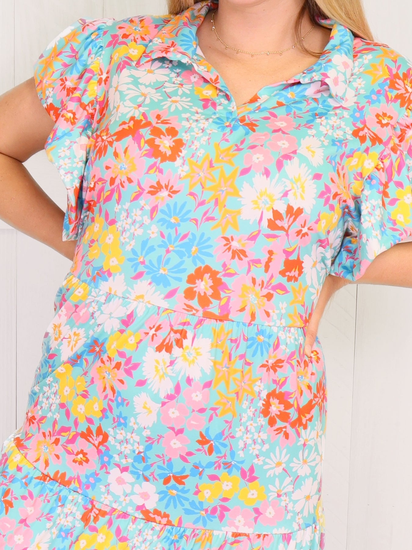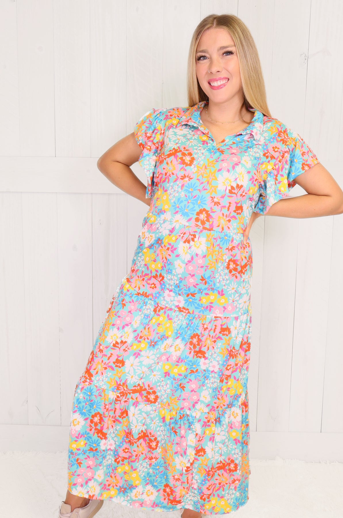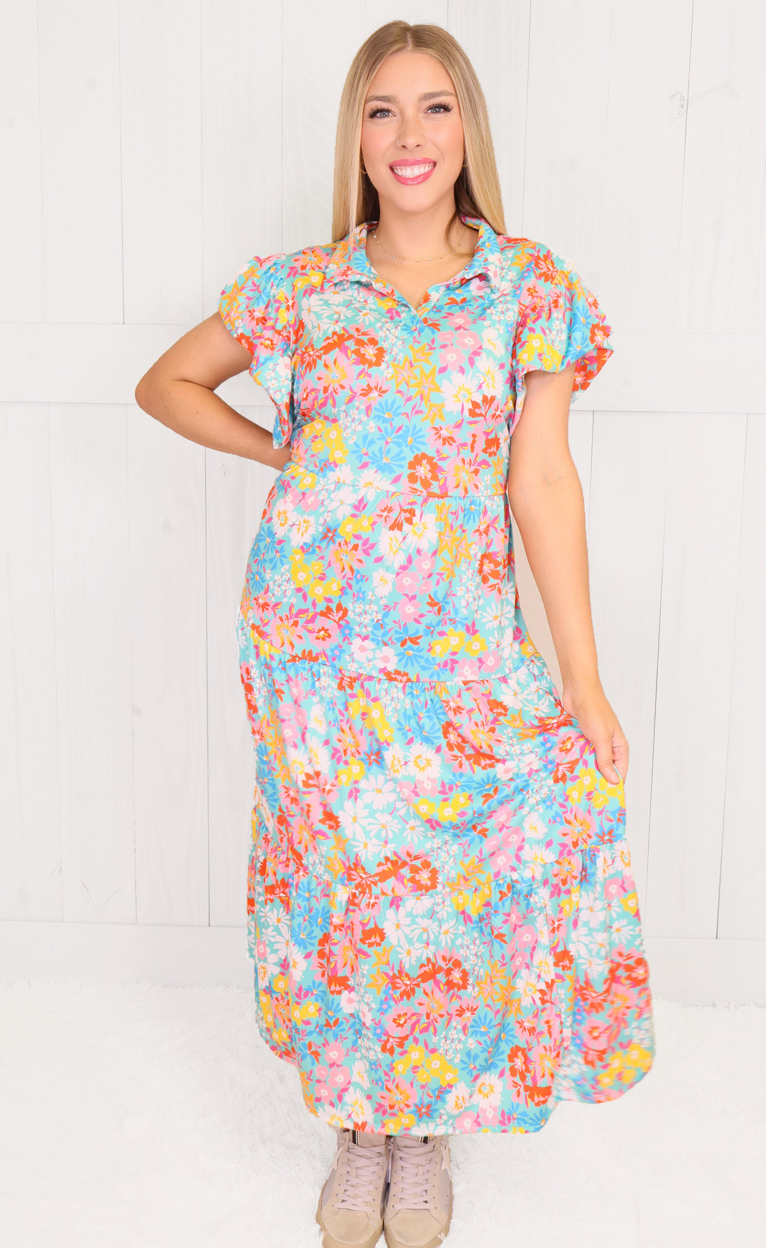 This Floral Midi with Collared Notch Neck Dress is the perfect fusion of sophistication and femininity. The beautiful floral design adds a touch of charm, while the collared notch neck brings a sleek and elegant touch. Stay effortlessly stylish in this midi dress for any occasion.