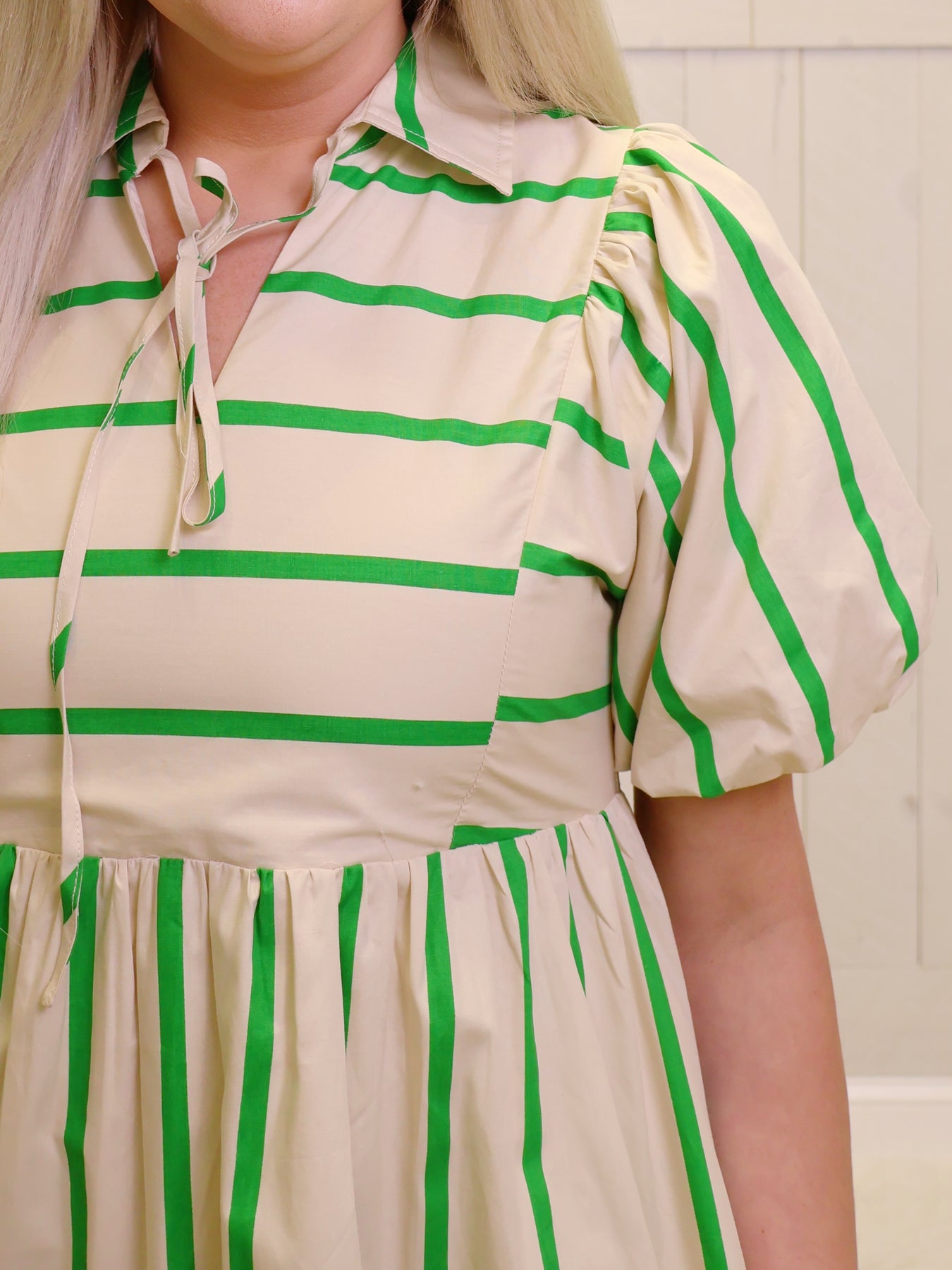 Elevate your style with the Jodifl Green and Cream Striped Dress. Featuring graceful puff sleeves, this dress offers a unique blend of comfort and sophistication. A perfect choice for any occasion, it will leave you feeling confident and elegant.