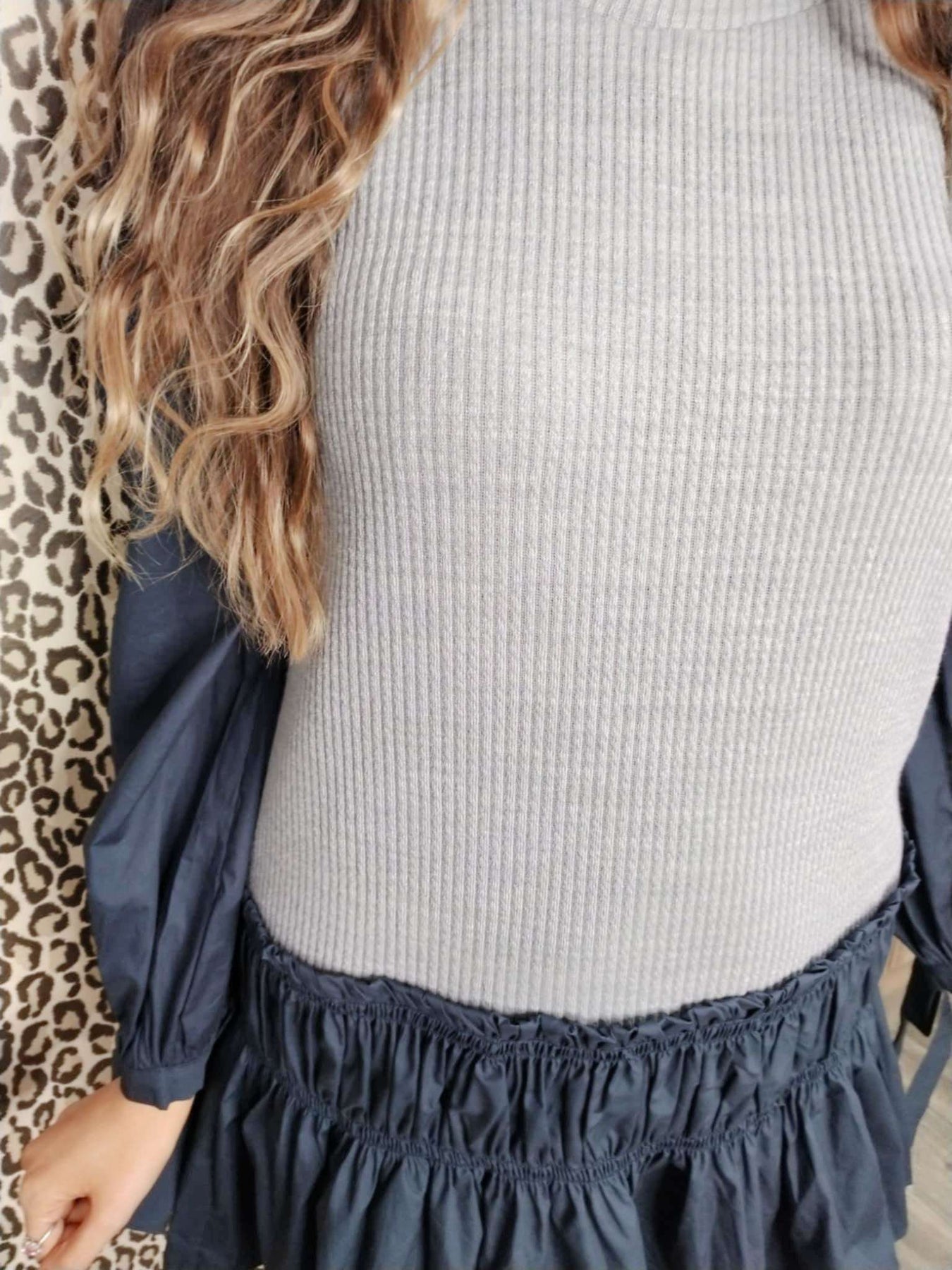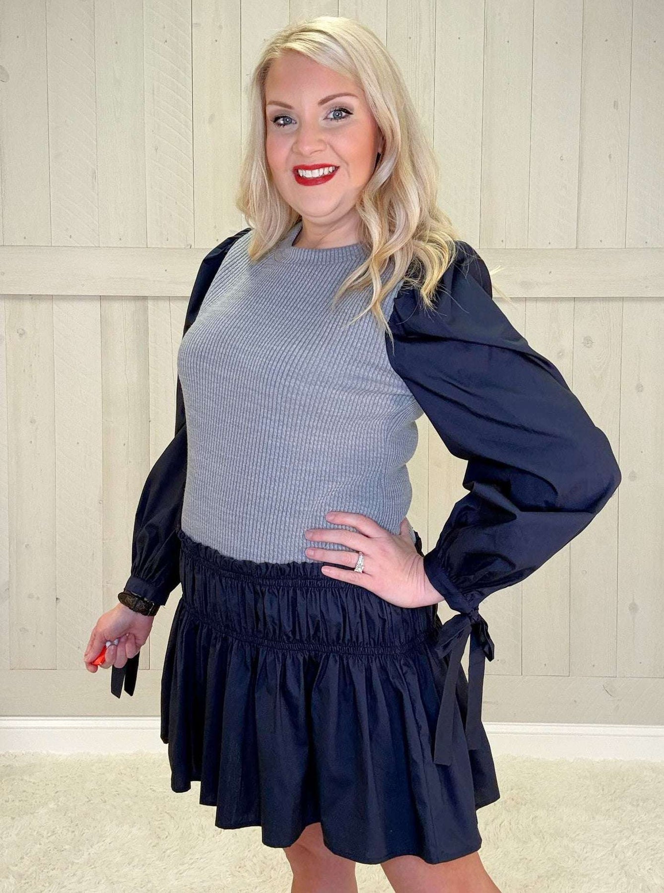 Elevate your style with this Navy/Gray Ruffle Dress. Its elegant design, versatile colors, and flattering silhouette make it a must-have for any wardrobe.