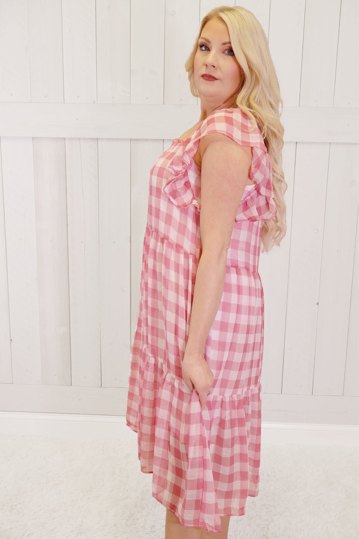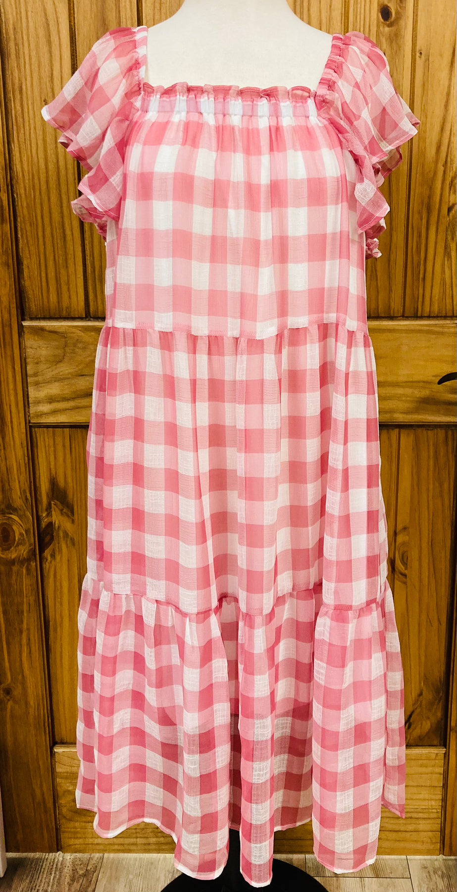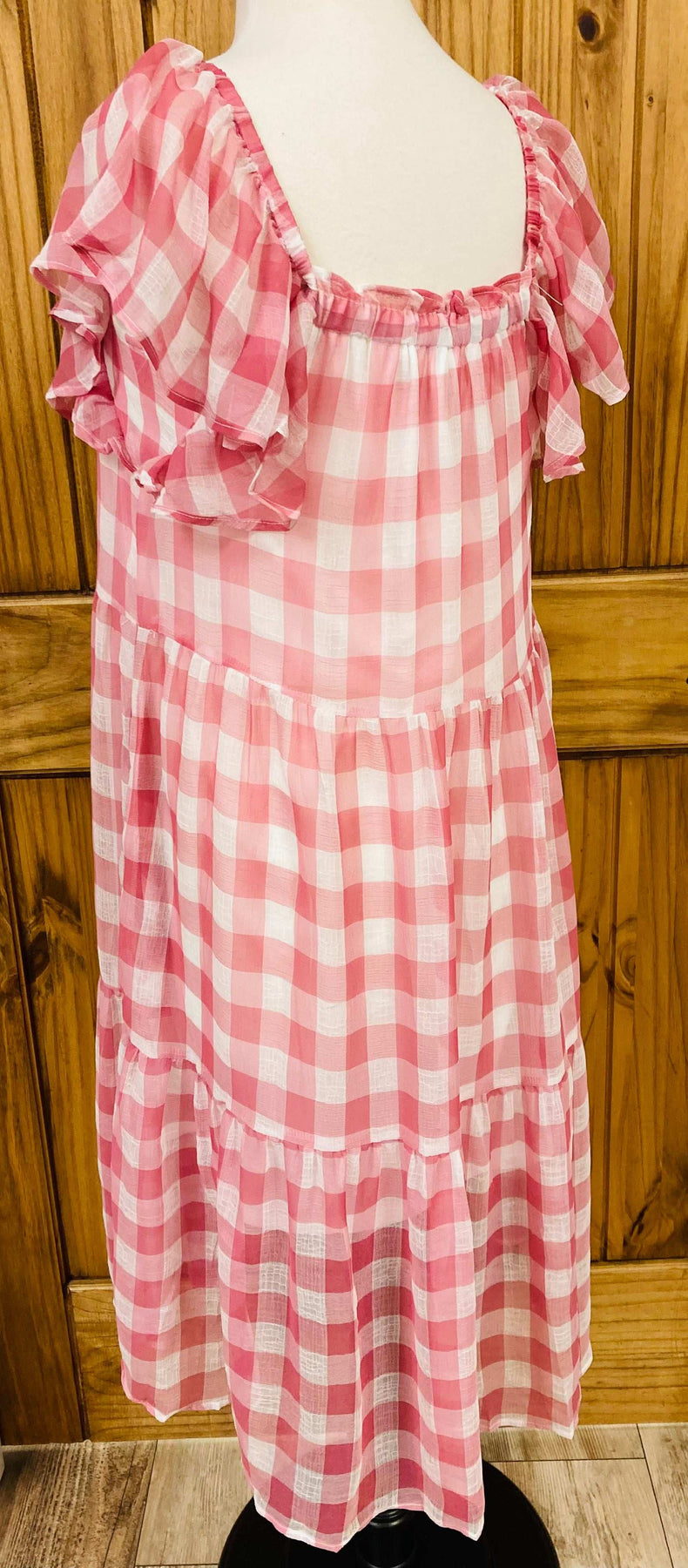 This stylish Pink Gingham Dress features a square elastic neckline and convenient pockets, providing both comfort and functionality. Made with pink gingham fabric, this dress is perfect for any occasion, making you stand out with its unique and chic design. Look effortlessly beautiful with this must-have dress.