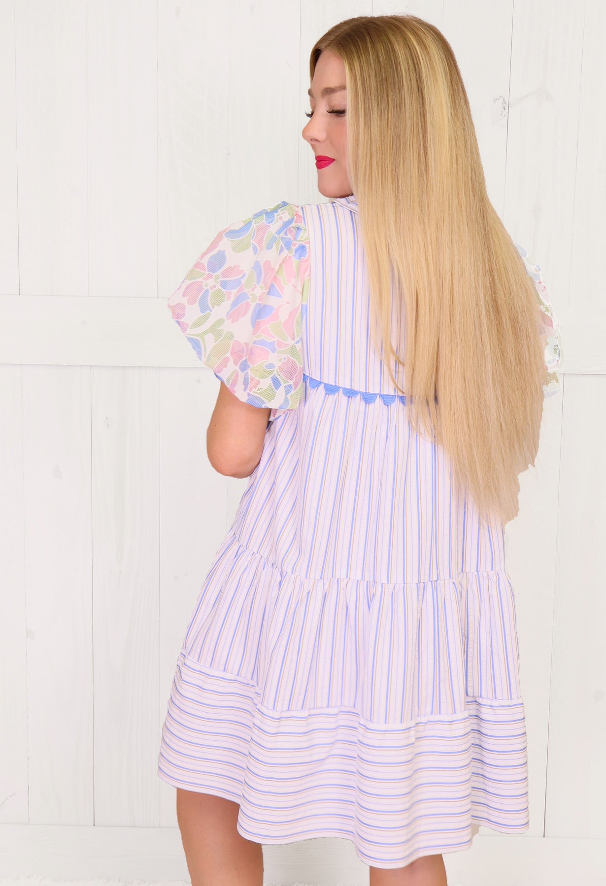 This Umgee dress combines a mix of floral and stripe patterns, creating a unique and stylish design. The dress features ruffle detailing, adding a touch of femininity to the overall look. Perfect for any occasion, this dress is sure to make a statement and turn heads.