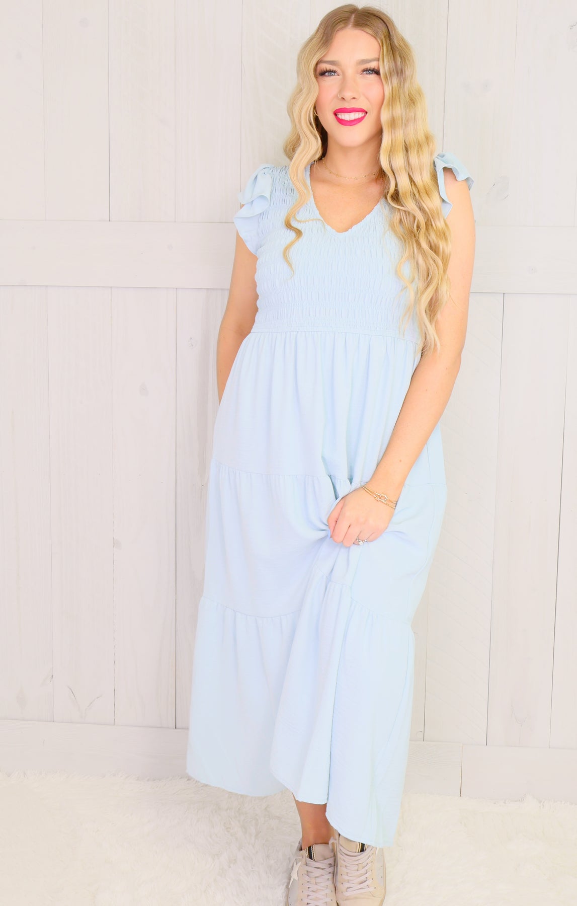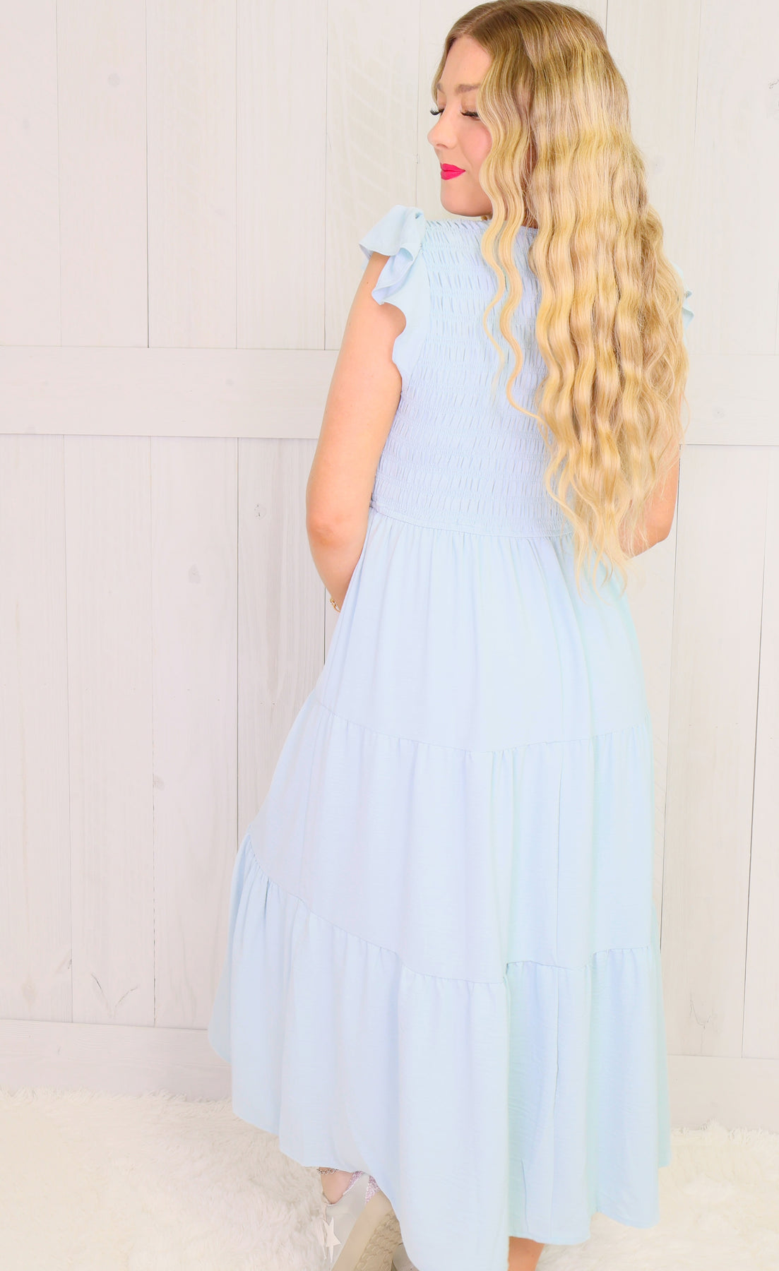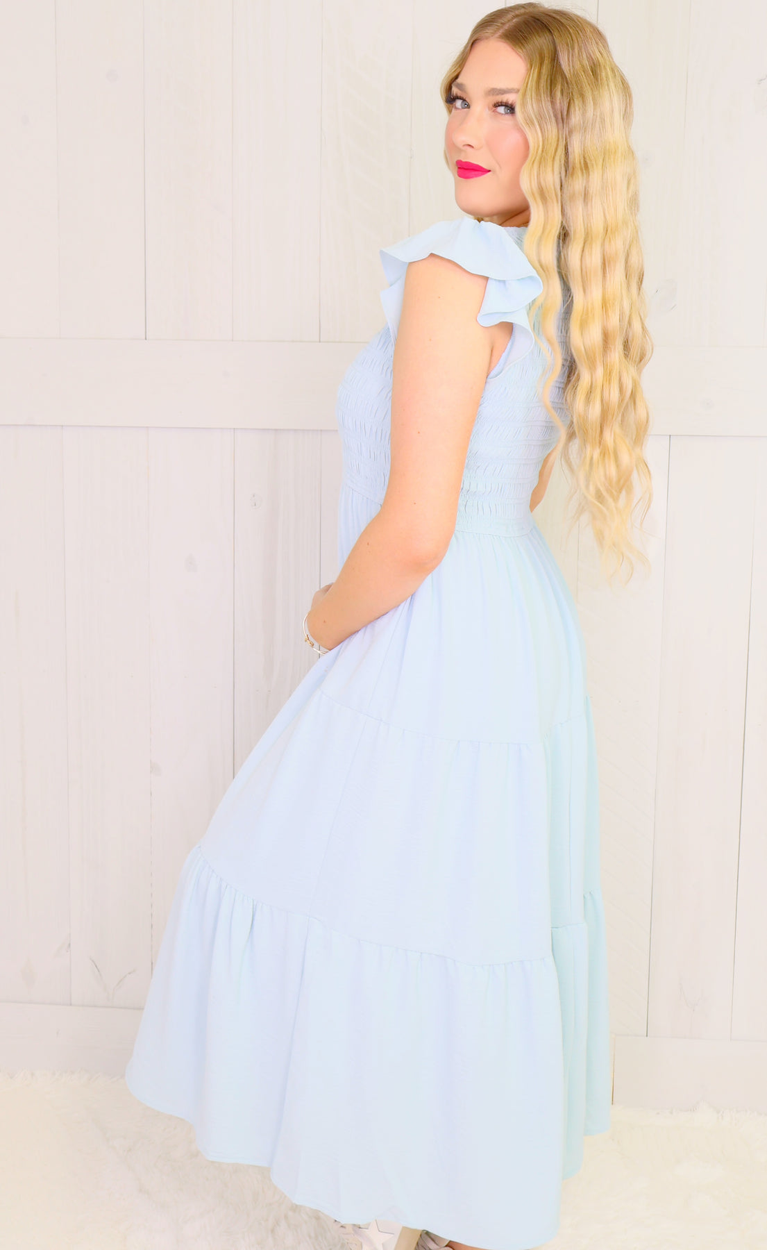 Elevate your wardrobe with our Light Blue Smocked Midi Dress. The light blue color adds a touch of elegance to the smocked design, creating a flattering and versatile piece. Crafted with attention to detail, this dress is sure to become a staple for any occasion.