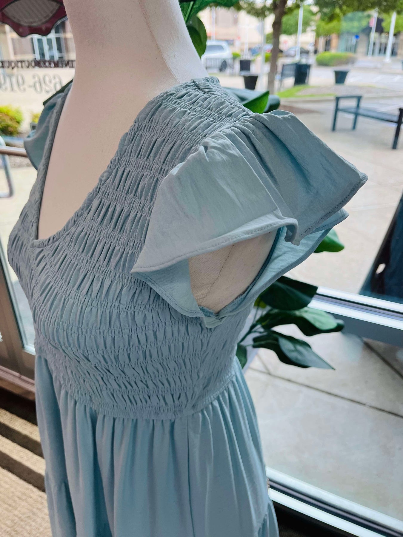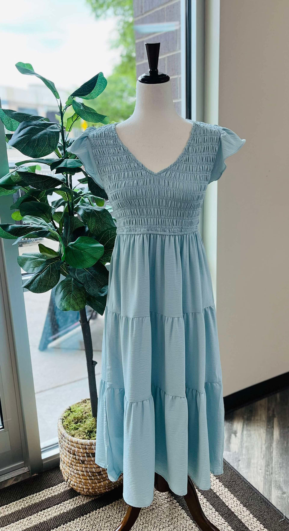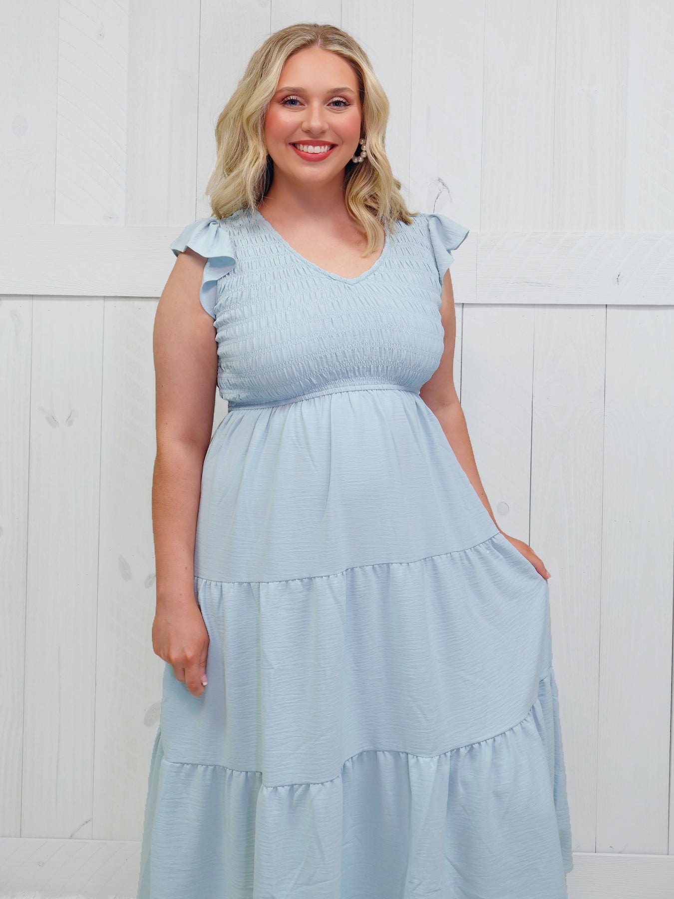 Elevate your wardrobe with our Light Blue Smocked Midi Dress. The light blue color adds a touch of elegance to the smocked design, creating a flattering and versatile piece. Crafted with attention to detail, this dress is sure to become a staple for any occasion.