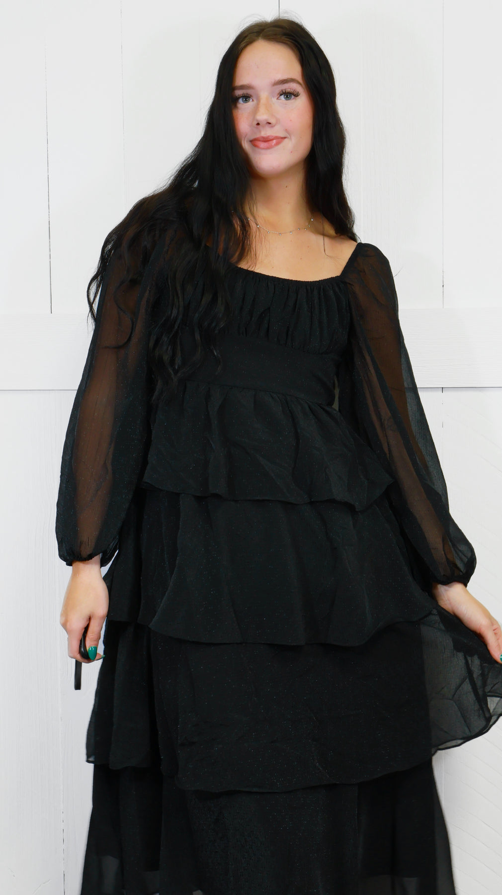 Elevate your style with our Women's Black Ruffle Tiered Midi Dress. The sleek black color will add a touch of sophistication to any occasion. Made with premium quality material, this dress will not only make you look stunning but also ensure comfort. Perfect for any formal event.