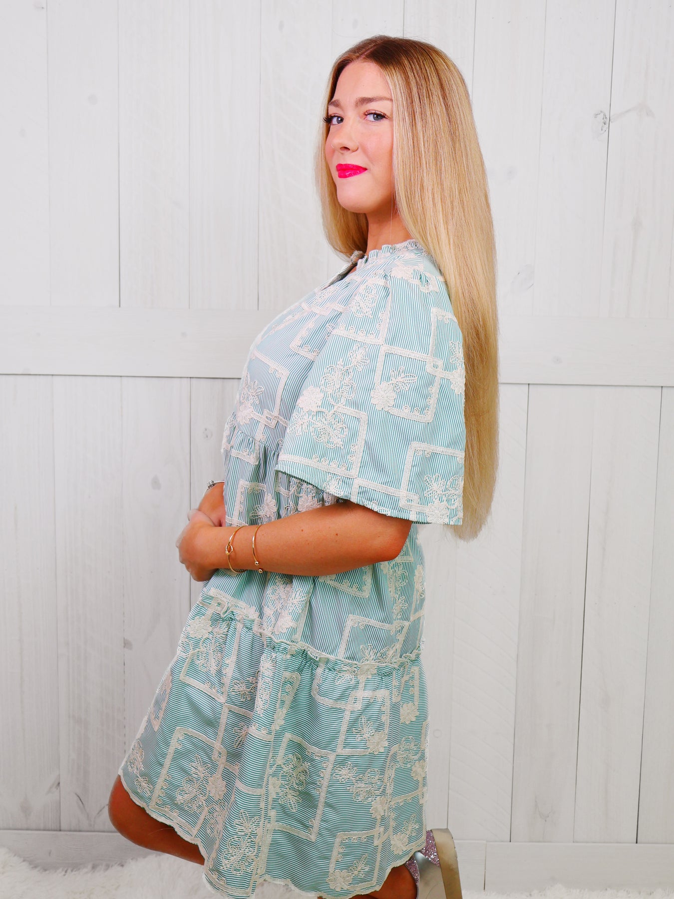 Crafted with an eye-catching green striped design and delicate floral embroidery, the Women's Voy dress is both elegant and adorable. Perfect for any occasion, this woven dress is sure to turn heads with its unique style.
