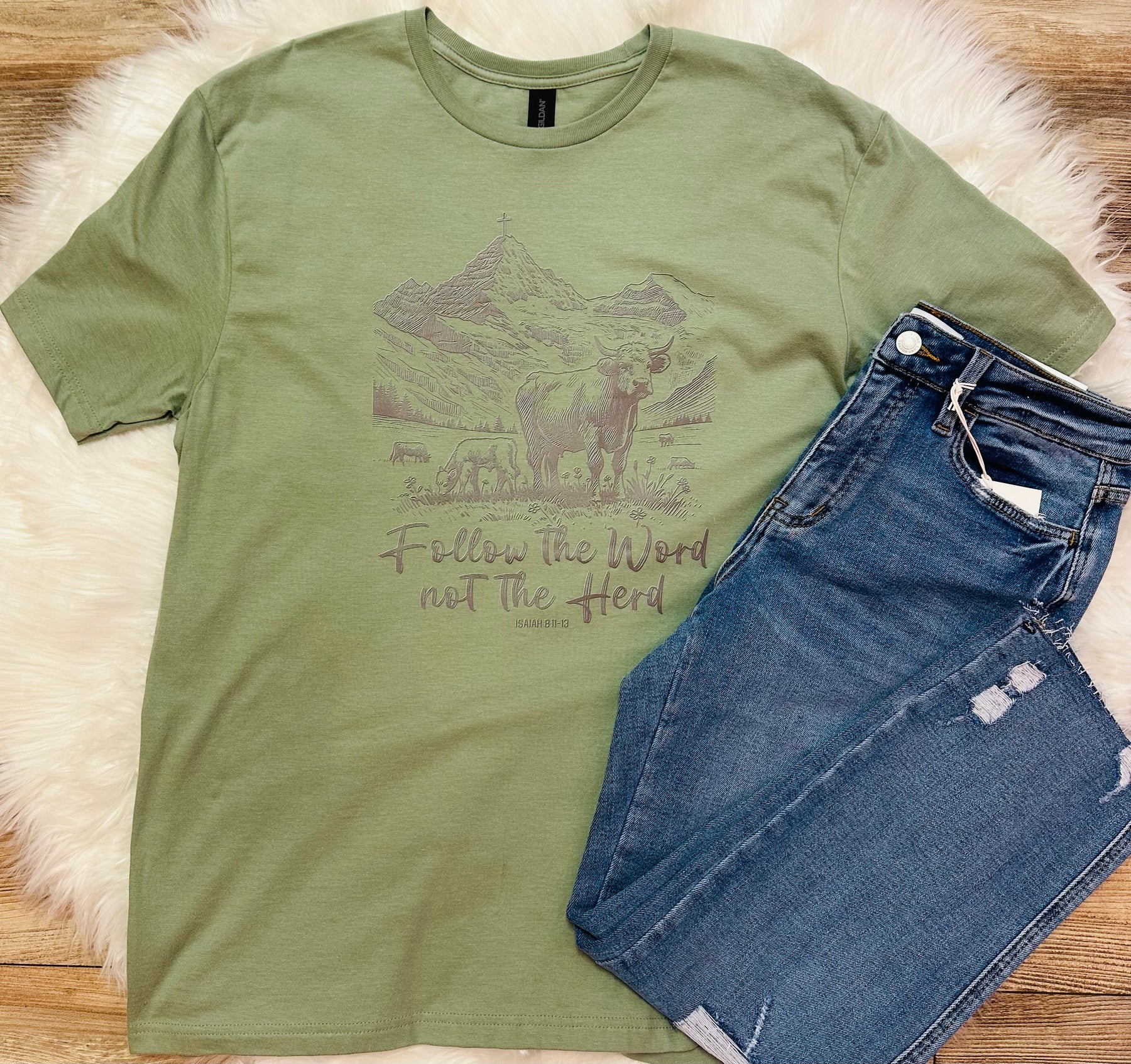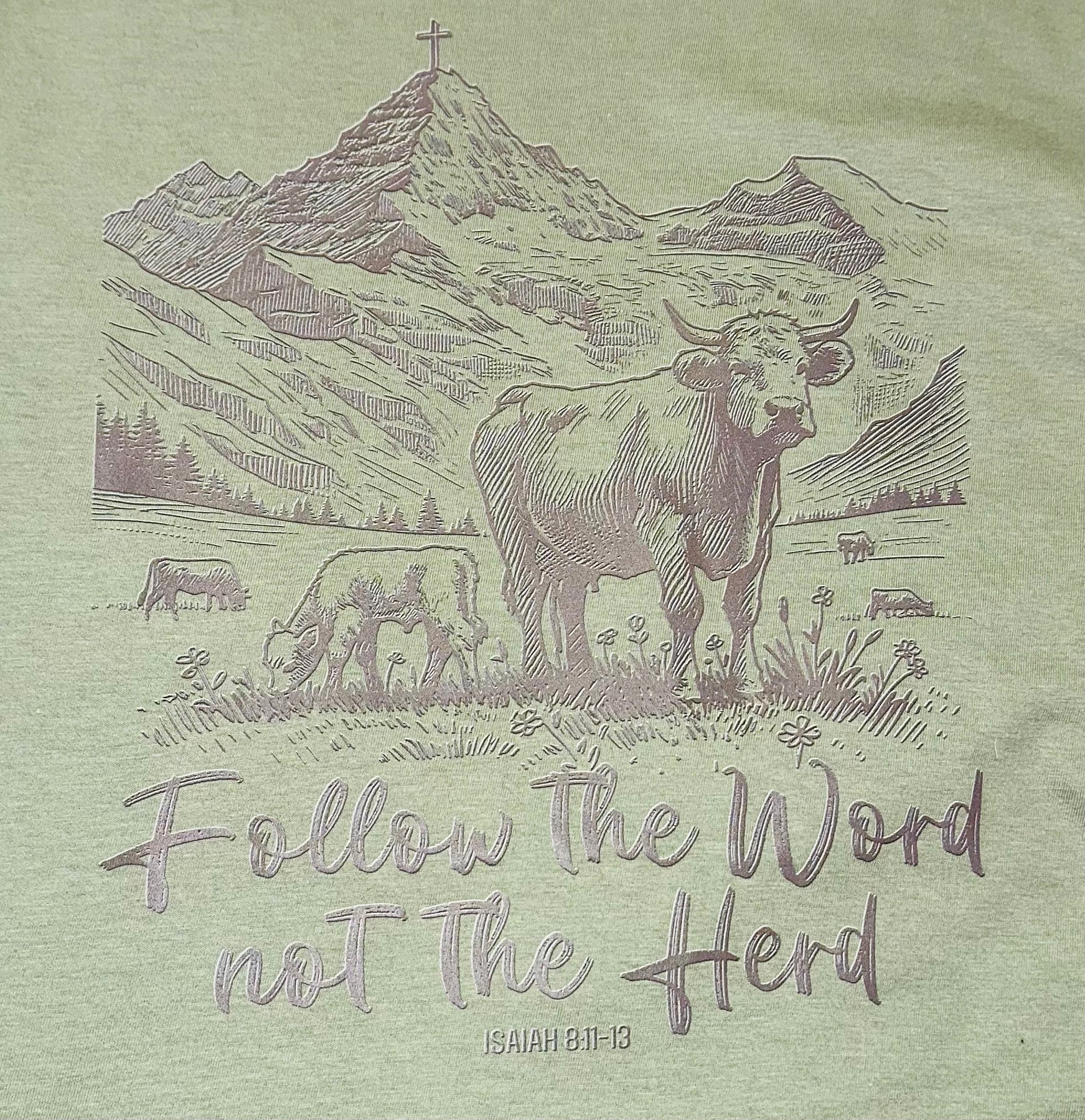 This Follow the Word not the Herd Tee in sage green is perfect for those who value individuality and originality. Made with high-quality materials, this tee offers both comfort and style. Show off your unique perspective and stand out from the crowd with this one-of-a-kind shirt.