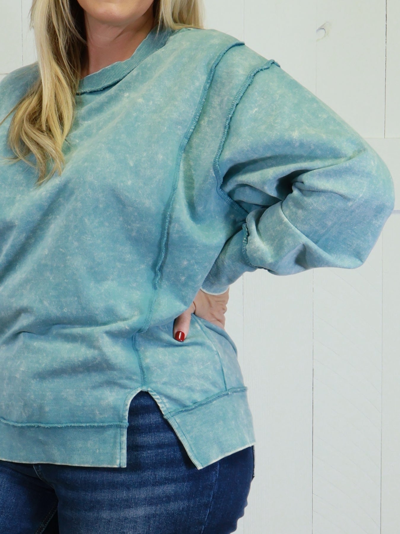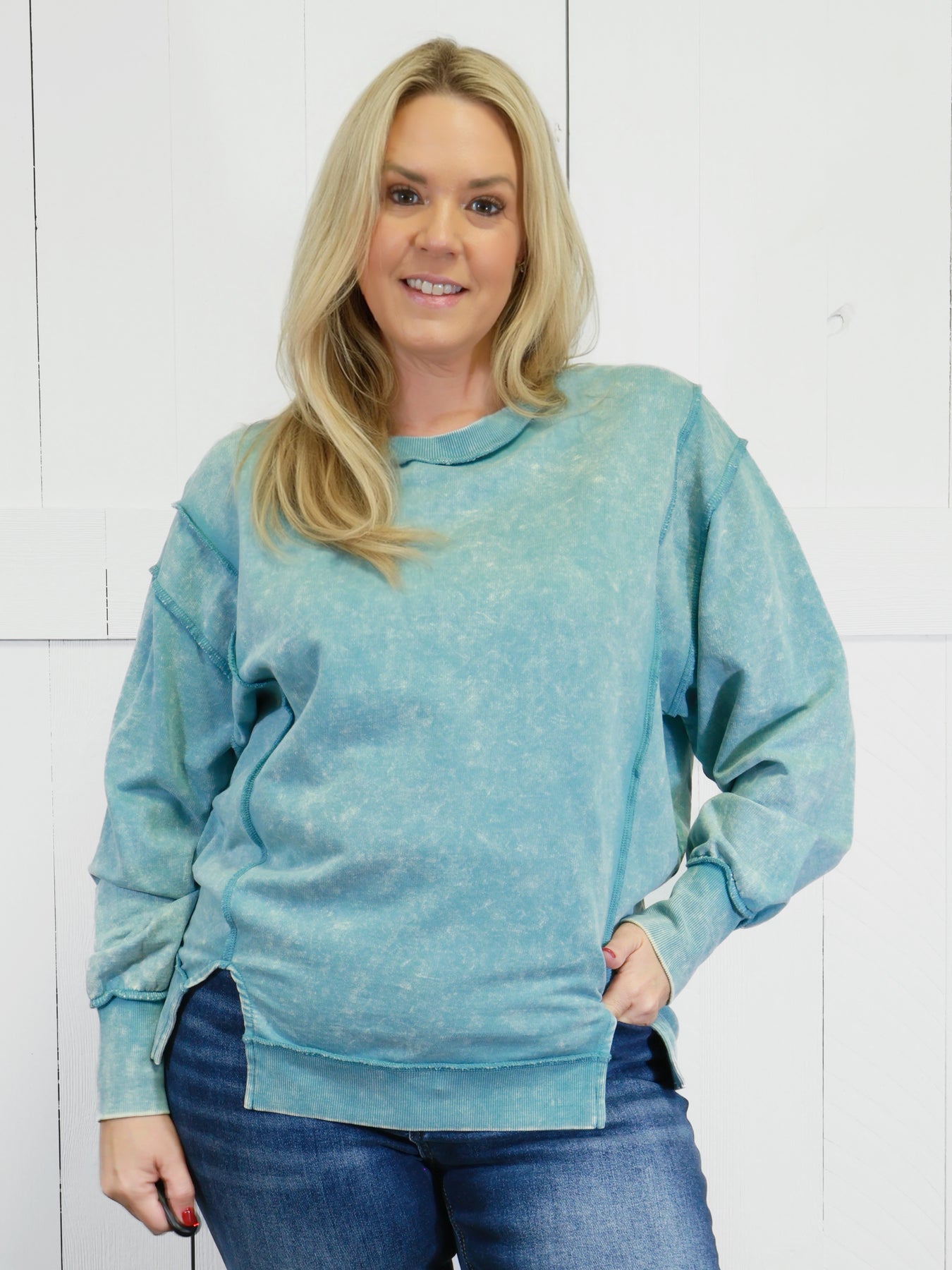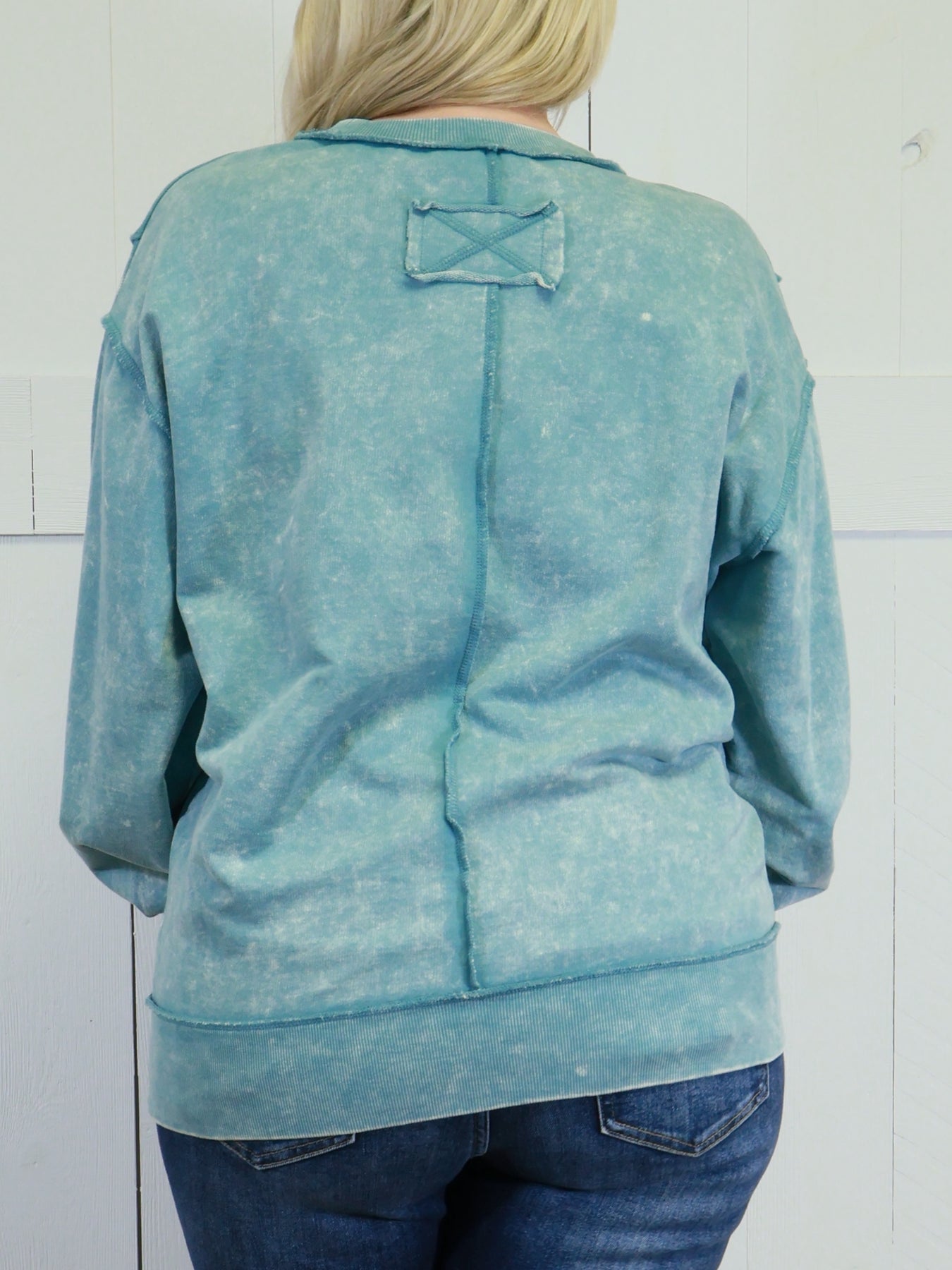 Zenana Basic Acid Wash Terry Exposed Seam Sweater Pullover Ash Blue