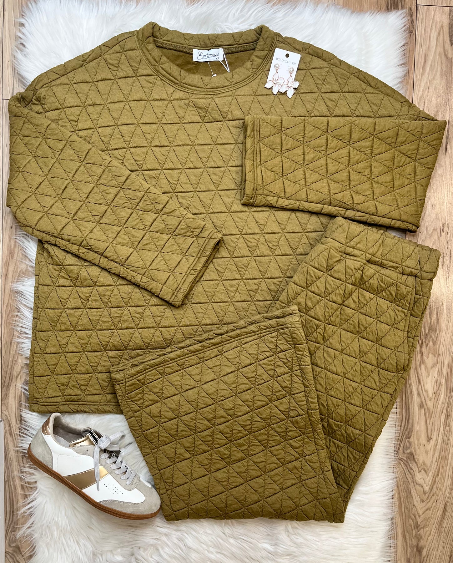 The Women’s Olive Green Pant Set features a quilted construction, providing enhanced insulation and comfort. This design aids in temperature regulation, offering warmth without added bulk. The set is suitable for various activities, ensuring practicality and style in cooler conditions. Ideal for both casual and semi-formal occasions.