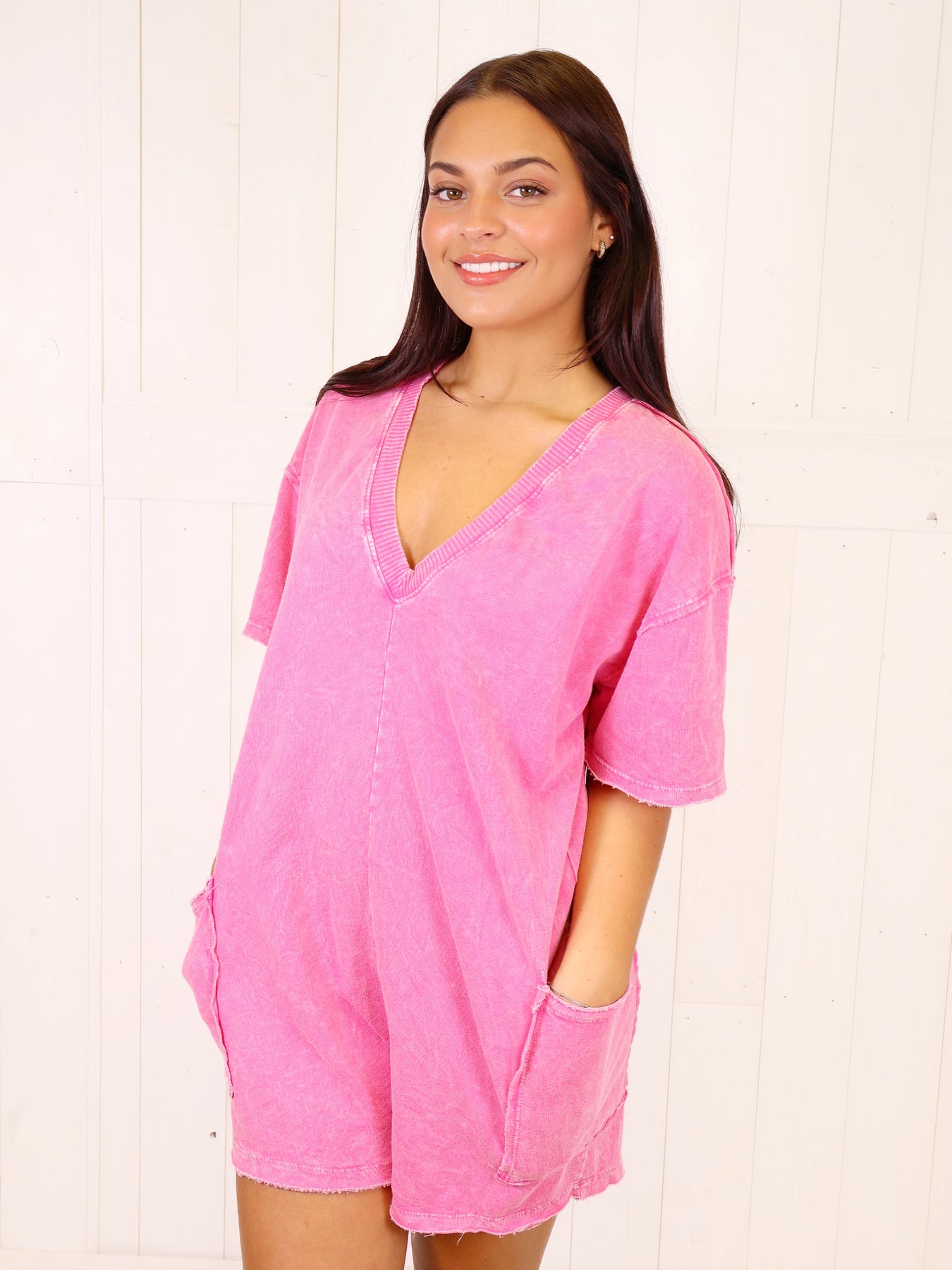 The Acid Wash Pocket Romper in Hot Pink offers a flexible and comfortable style. The acid wash gives it a unique and trendy feel, while the pockets add convenience. Perfect for a casual day out, this romper combines fashion and functionality effortlessly. Oversized Fit.