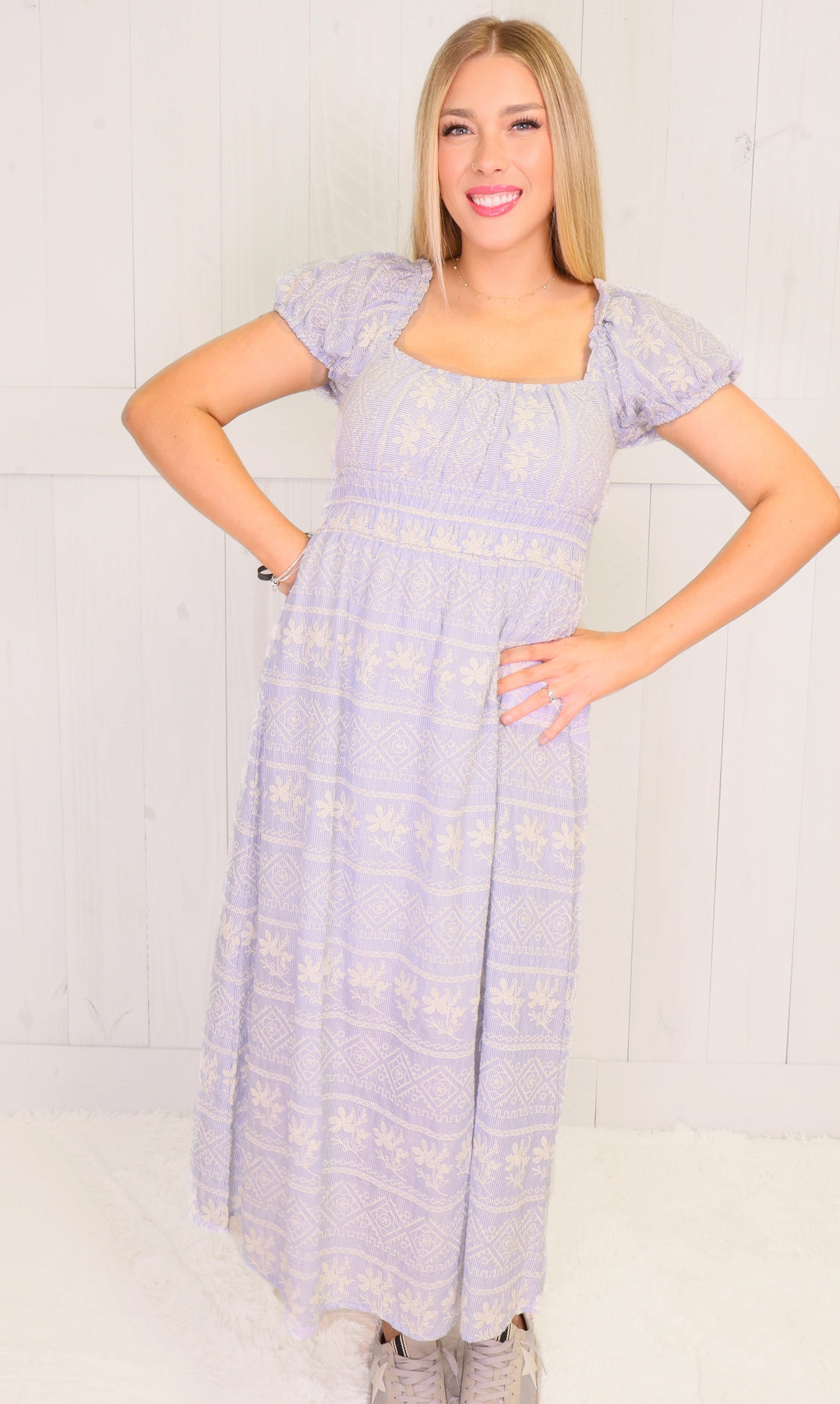 This blue stripe floral embroidered dress features a delicate and intricate design that adds a touch of elegance to any occasion. Crafted with quality fabric and attention to detail, this dress offers both comfort and style. Stand out in this timeless piece and make a statement wherever you go.