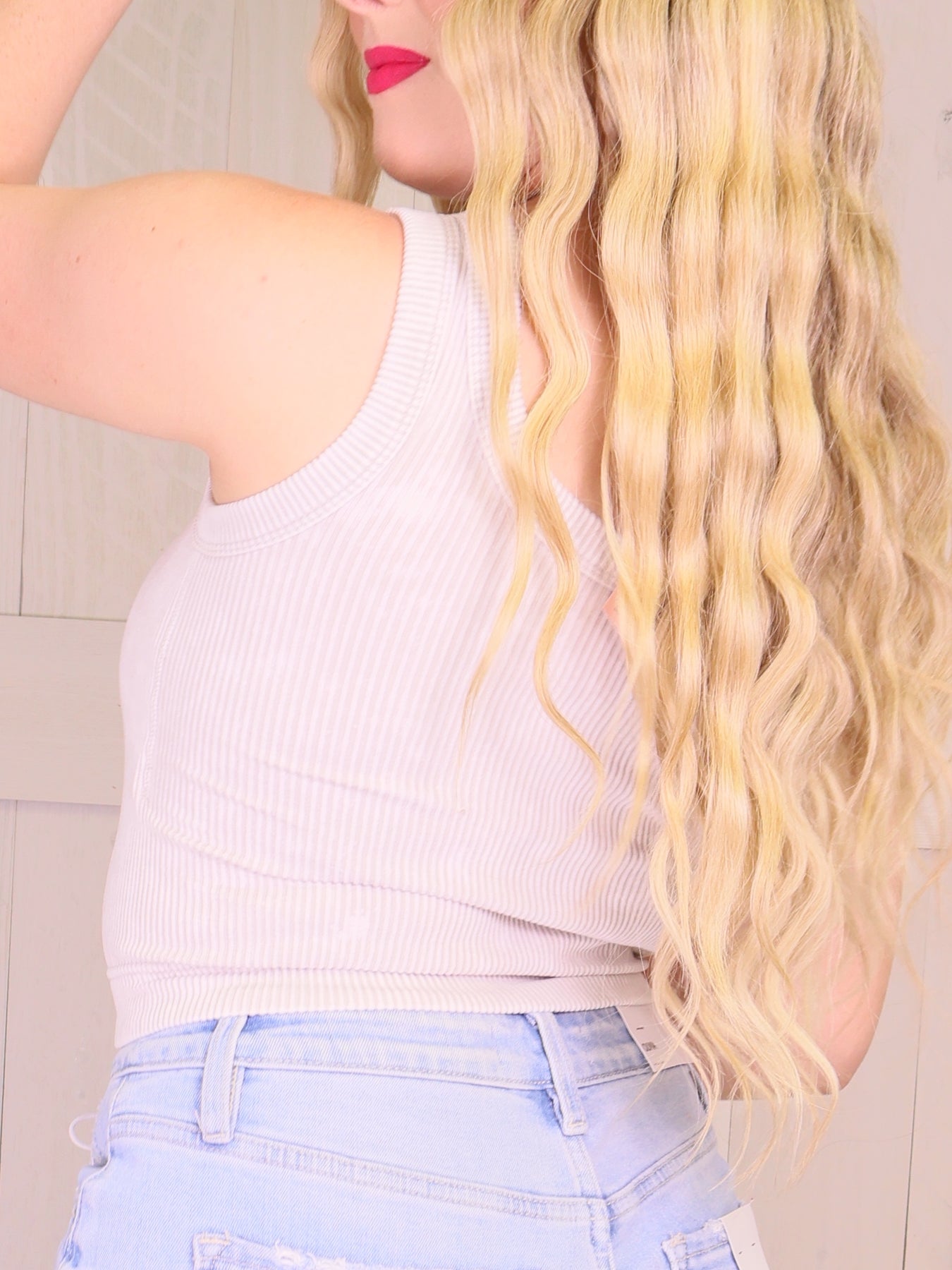 "This stone ribbed top features built-in bra pads for added support and comfort. Perfect for daily wear, it offers the convenience and functionality of a built-in bra without sacrificing style. Stay comfortable and confident all day long!"