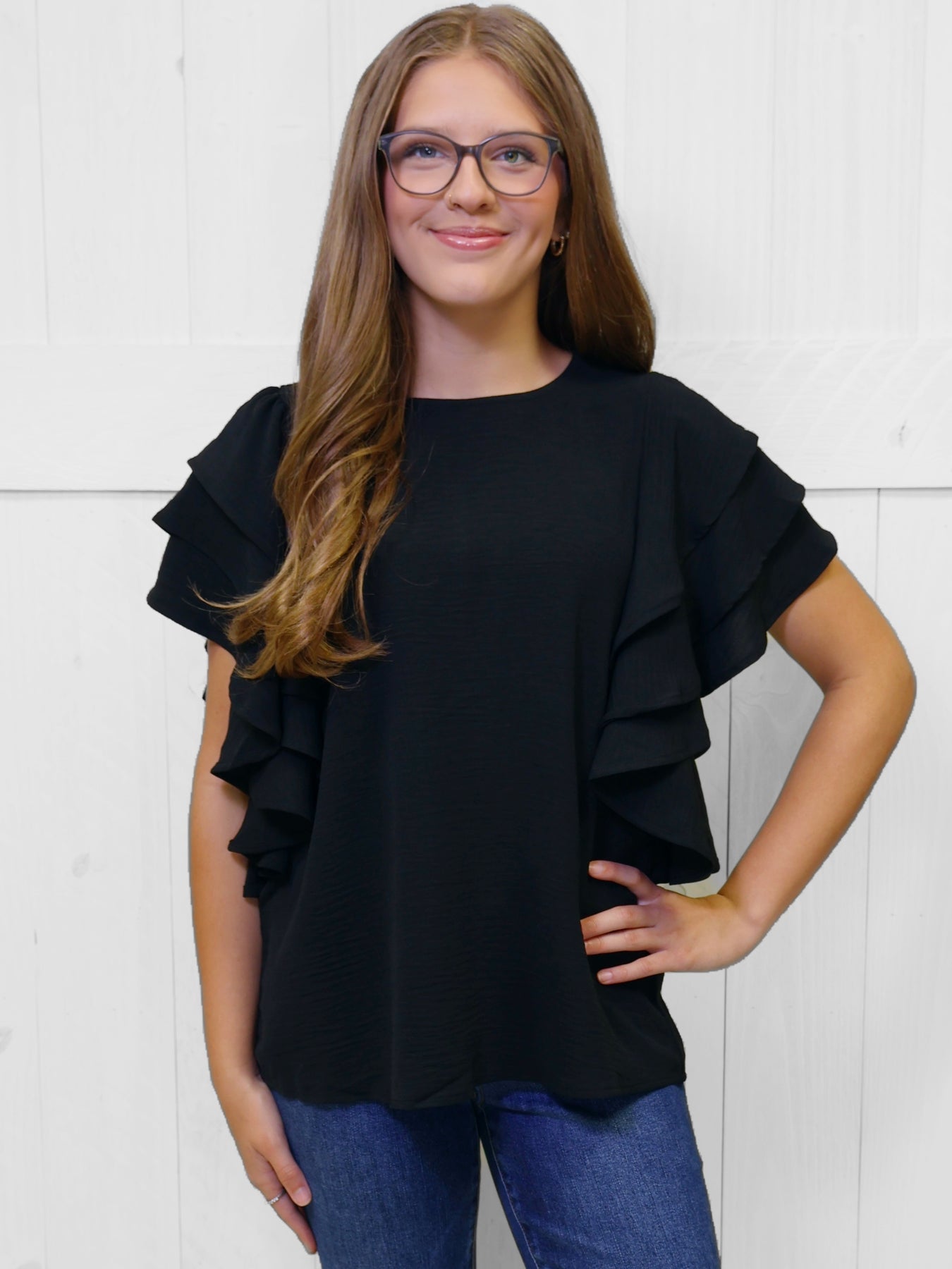 This Ruffle Sleeve Top adds a touch of elegance to any outfit. With its unique ruffle sleeve design, it is perfect for both casual and formal occasions. Made from high-quality fabric, it offers comfort and durability. Elevate your style with this versatile and chic top.
