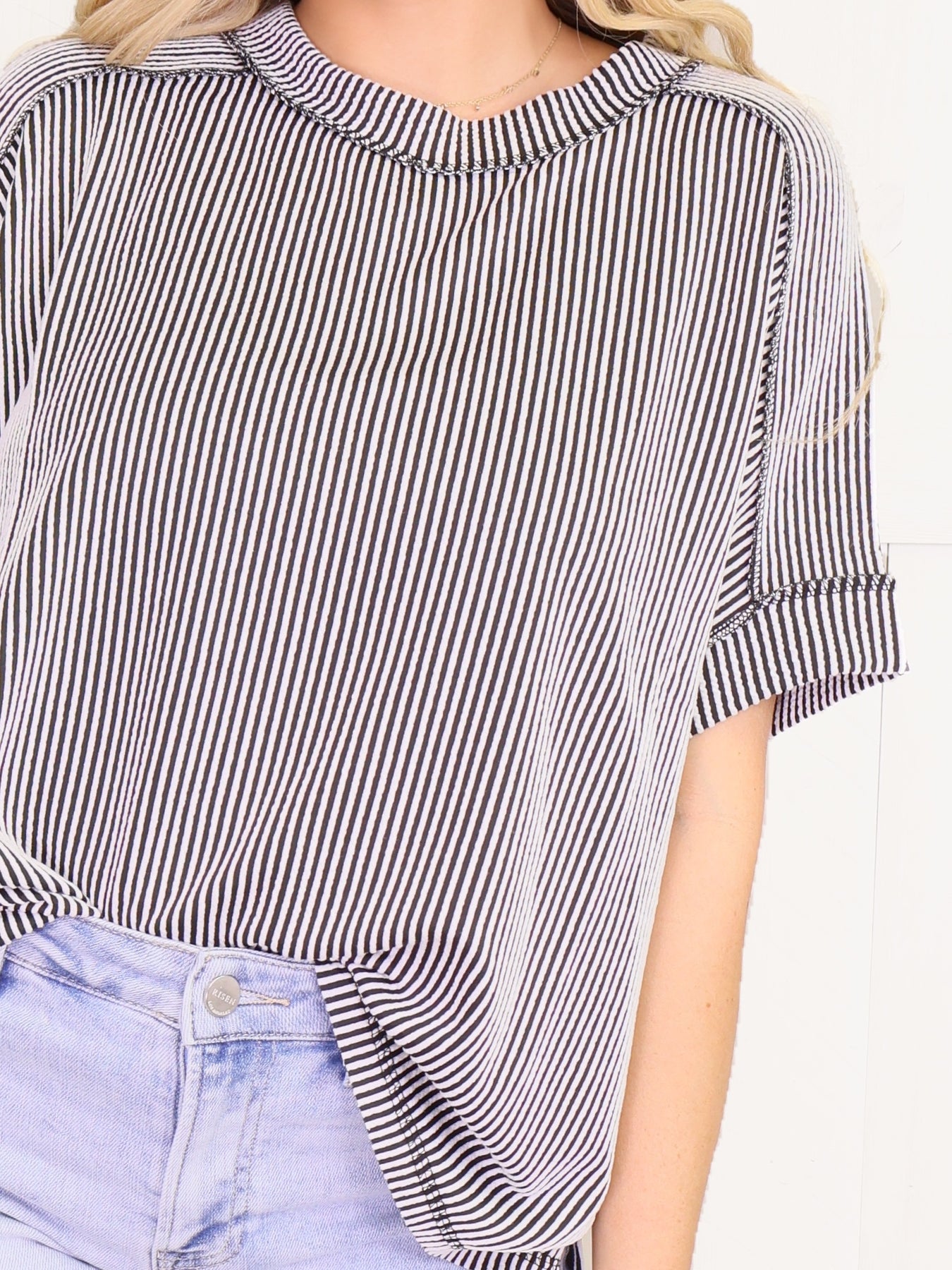 Introducing our Cuff Sleeve Ribbed Top - Black/White the perfect addition to your wardrobe! This beautiful top features a ribbed texture and stylish cuff sleeves, adding a touch of elegance to any outfit. The soft jade color is both feminine and versatile, making it easy to dress up or down for any occasion. Upgrade your style and comfort with our Cuff Sleeve Ribbed Top - Black/White