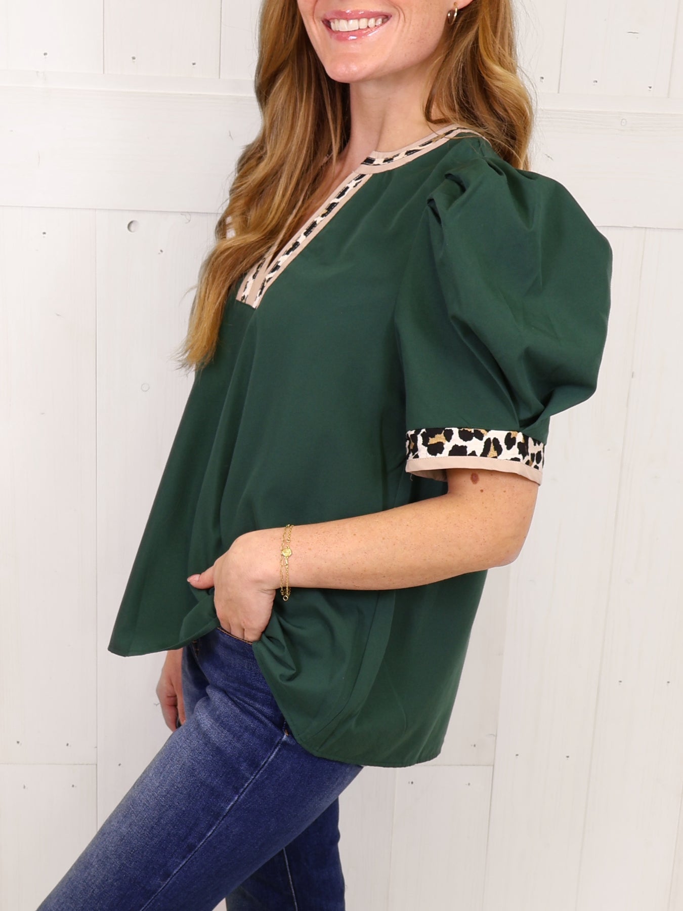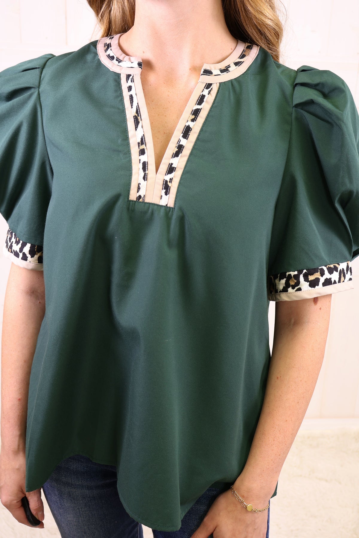 This hunter green top features a charming cheetah trim, adding a touch of stylish flair to any outfit. Made from high-quality materials, this top offers both comfort and fashion. Perfect for any occasion, this top is a must-have for any wardrobe.