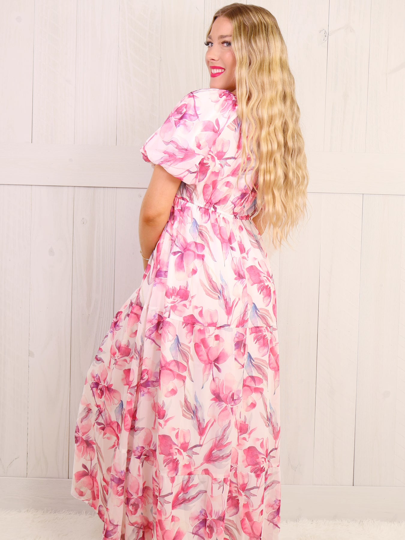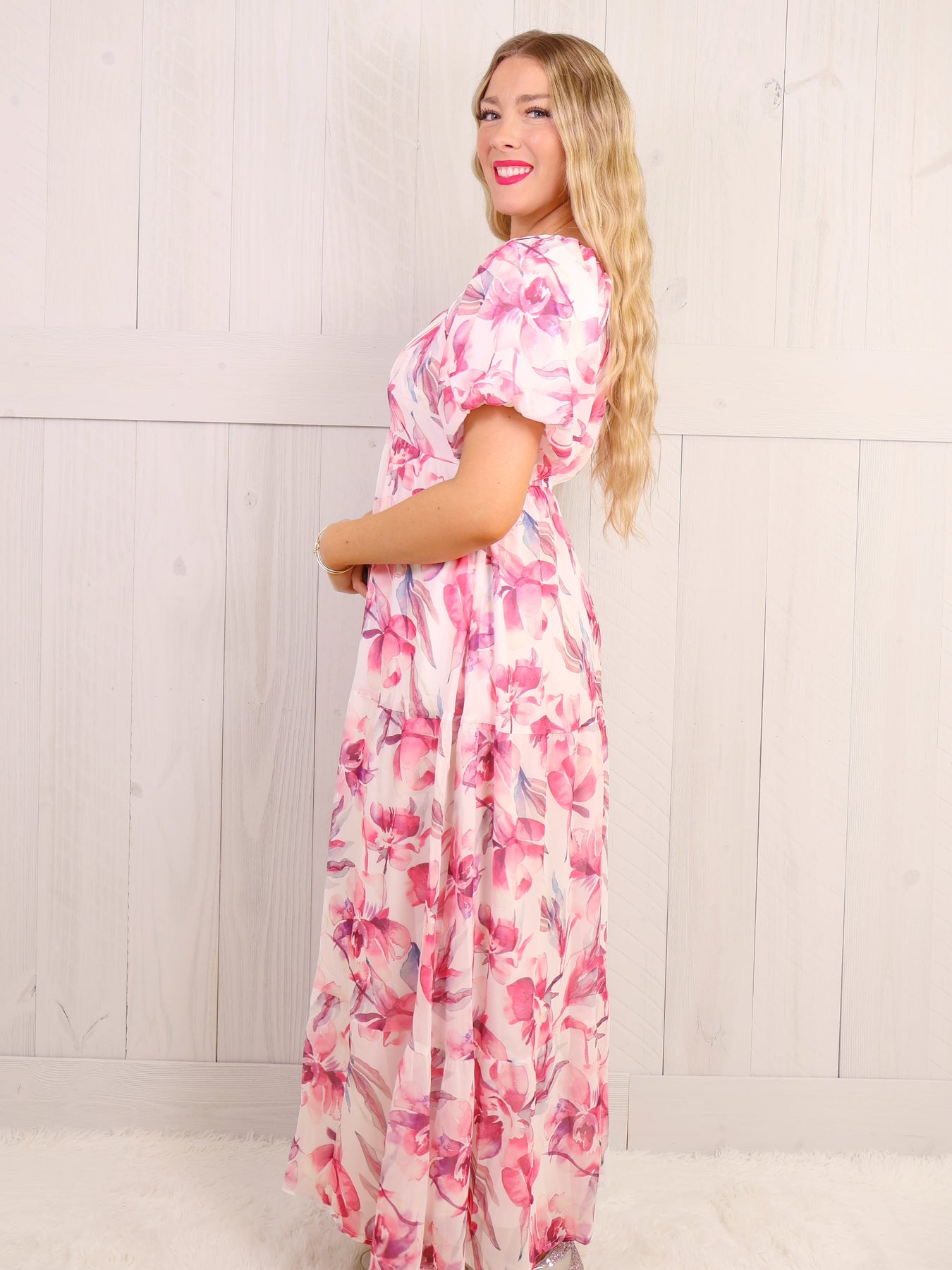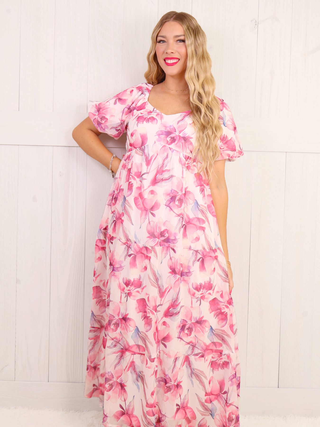 This elegant pink maxi dress features delicate floral patterns, perfect for a romantic picnic or a summer wedding. The airy silhouette and light fabric provide comfort and breathability, while the subtle design adds a touch of femininity. Made for any occasion, this dress is a must-have addition to your wardrobe.