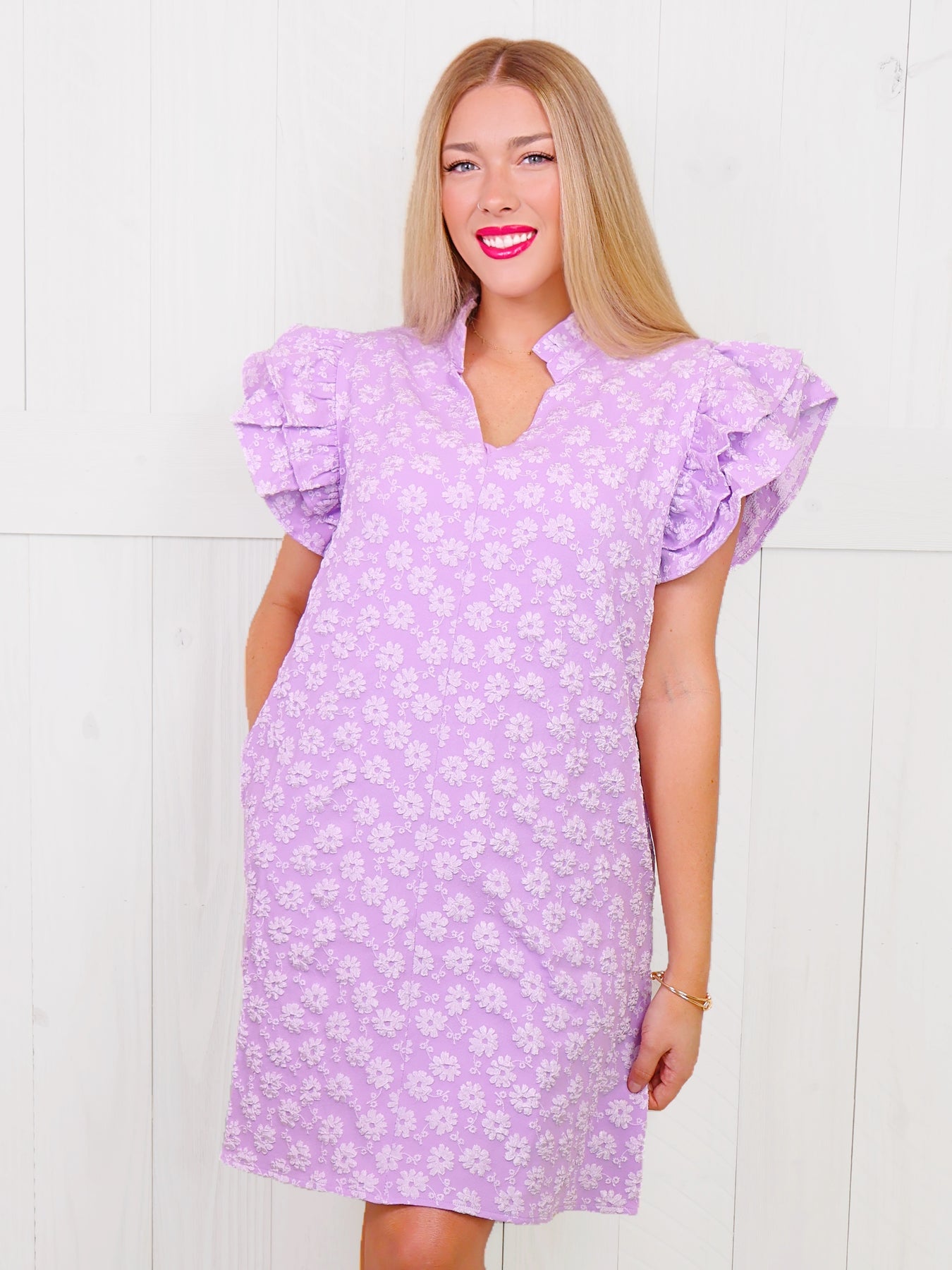 This Jodifl Lavender dress features delicate white lace and floral ruffle sleeves for a romantic touch. The feminine design is perfect for any occasion and will make you feel elegant and stylish. Made from high-quality materials, this dress is a must-have for your wardrobe.