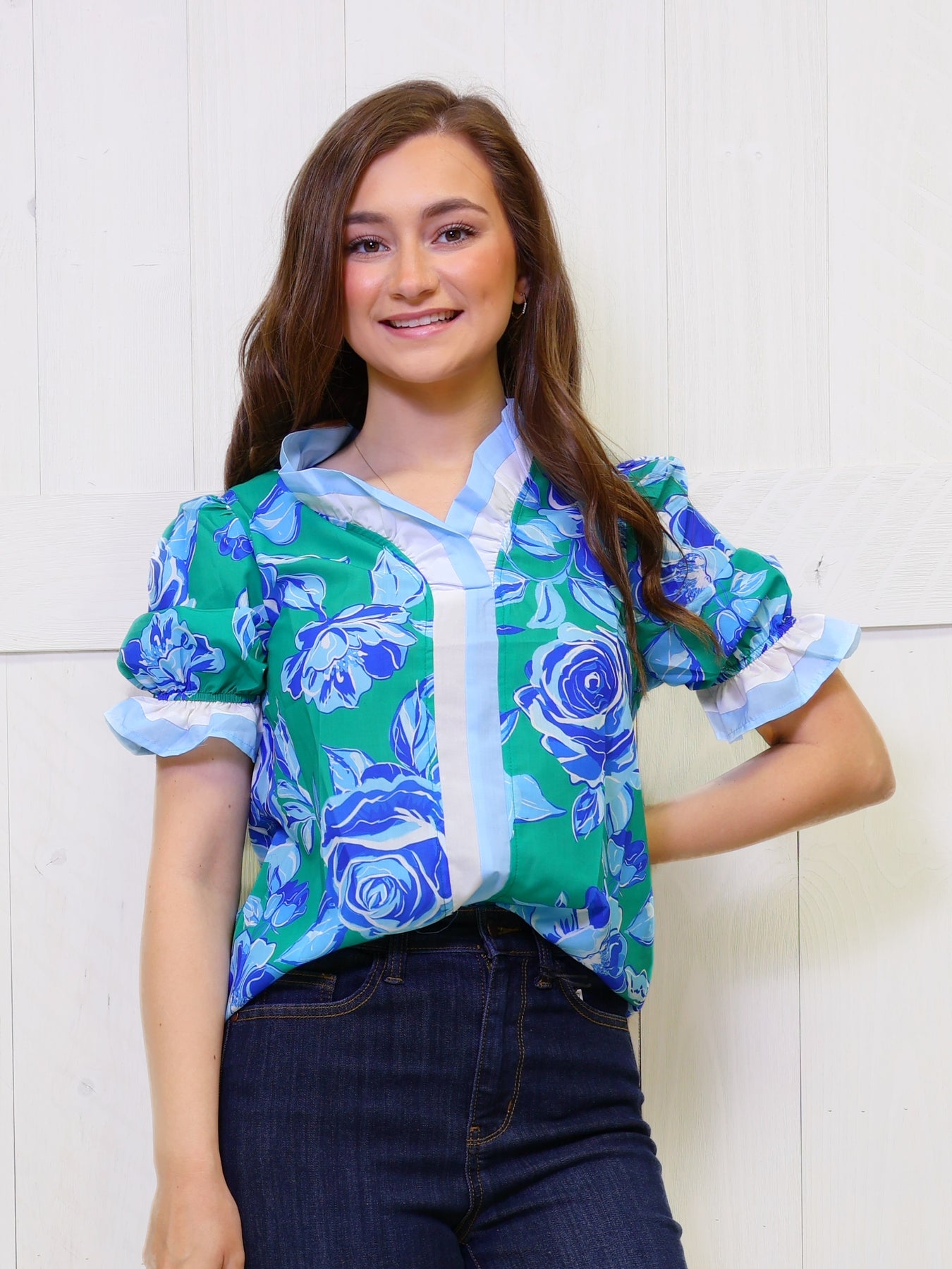 This green and blue floral top adds a pop of color to any outfit. Made with high-quality materials, it is comfortable and durable. The unique design is perfect for any occasion, making it a versatile and stylish addition to your wardrobe.