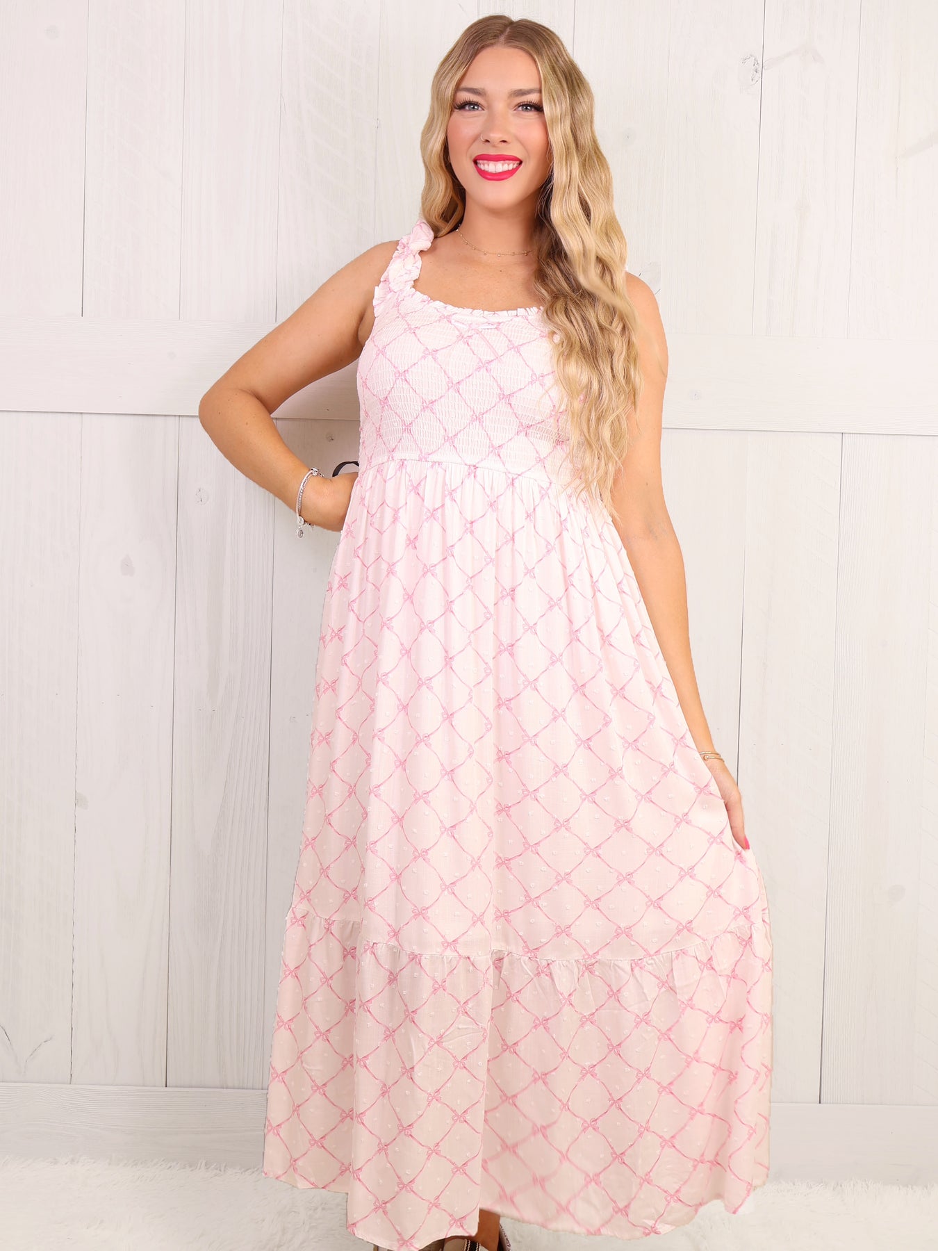 Elevate your wardrobe with our Pink Bow Maxi Dress. Featuring pink bows and a stunning maxi length, this dress exudes elegance and charm. Perfect for any special occasion, this dress will make you stand out from the crowd and leave a lasting impression. Make a statement and embrace your feminine side with our Pink Bow Maxi Dress.