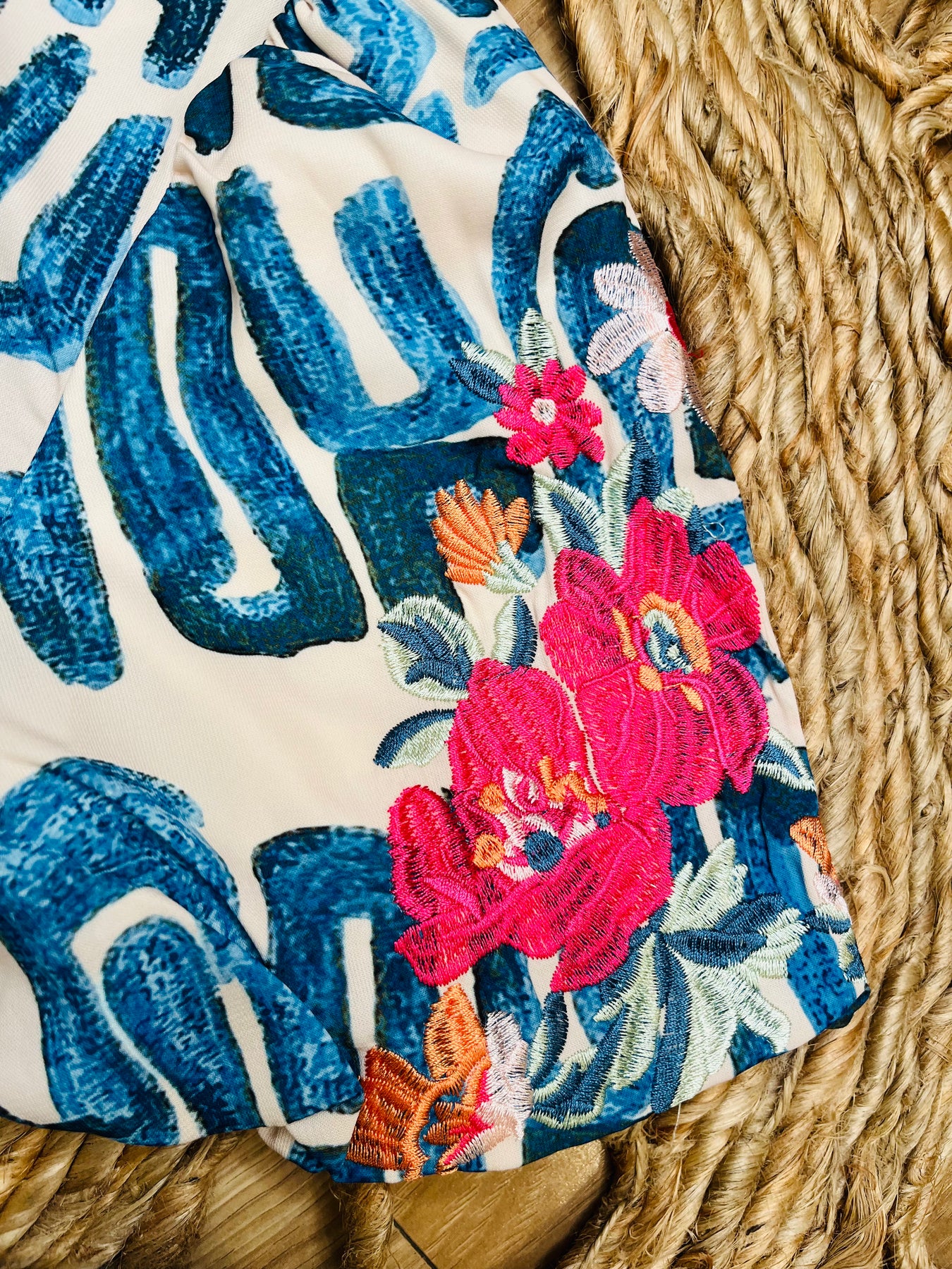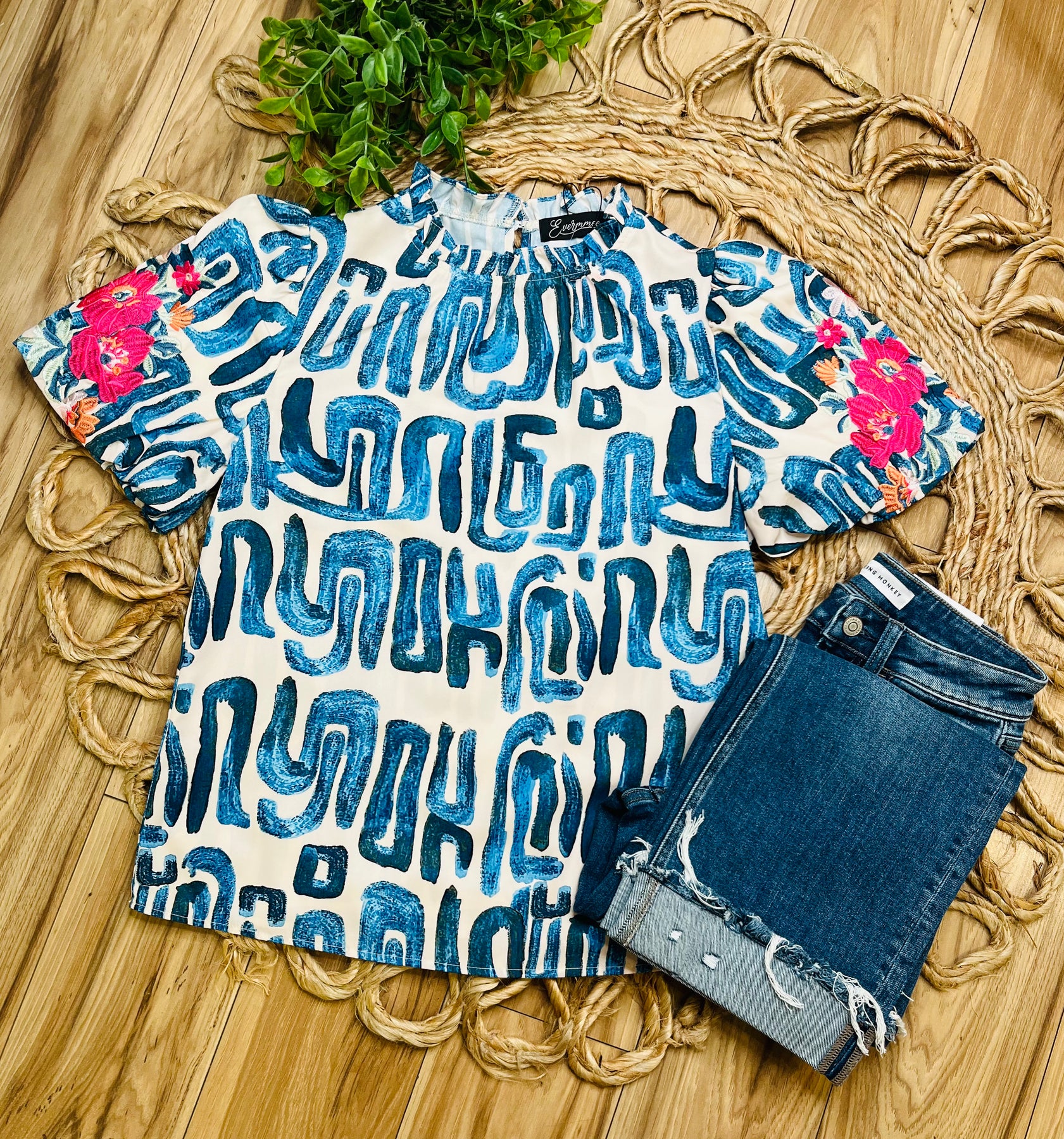 Discover the elegant design of the Women's Evermmee patterned top with delicate embroidered flowers on the sleeves. Embrace a touch of femininity and sophistication with every wear. Elevate your style with this unique and stylish top.