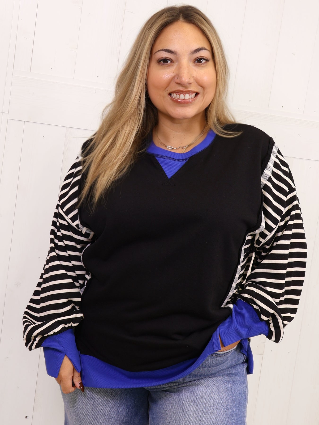 This Black Stripe with Royal Accent Pullover Top is a must-have for any wardrobe. Made with a pullover design, it provides easy and quick dressing, perfect for busy mornings. The stylish black and royal color combination is both versatile and chic, making it suitable for any occasion.