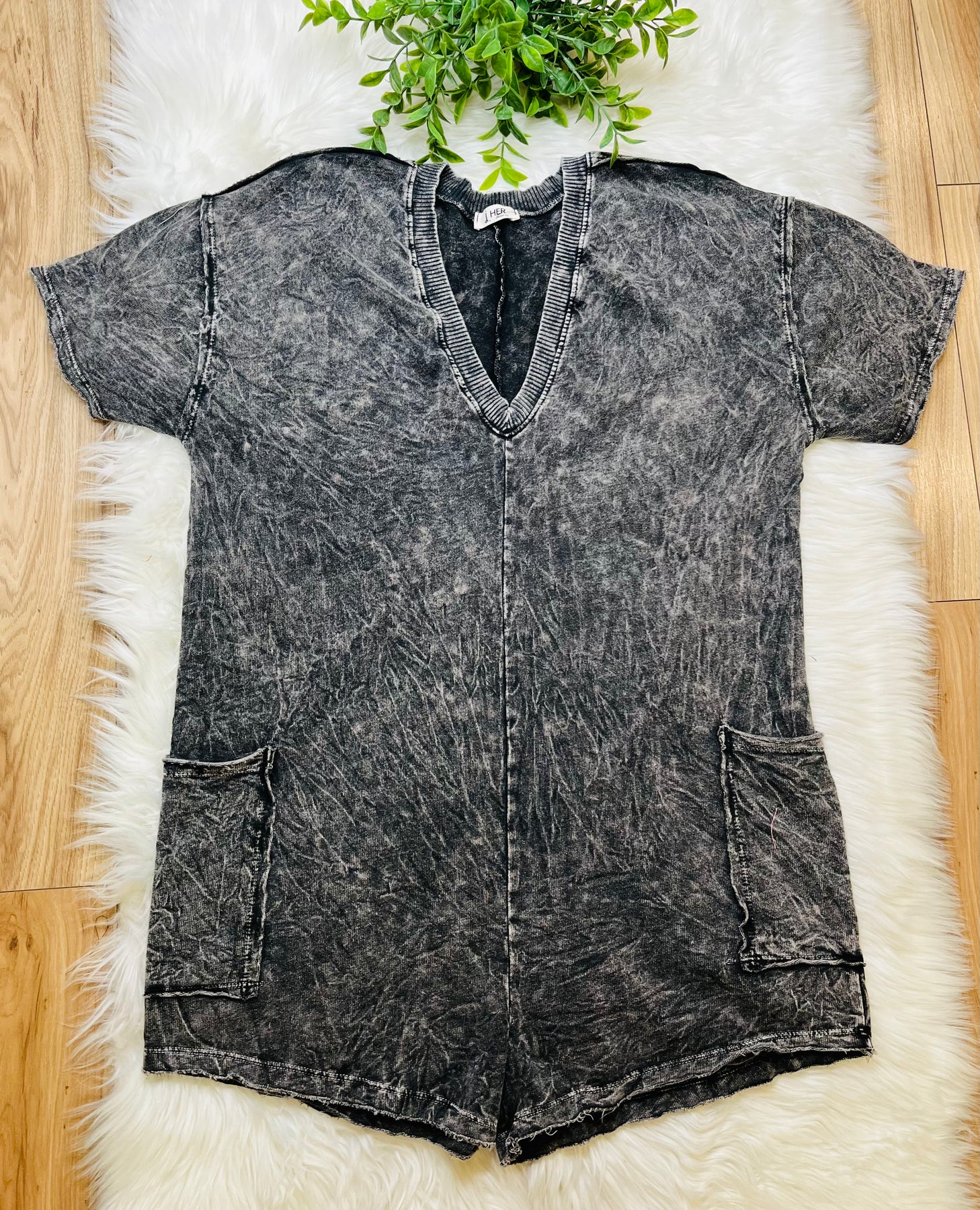 This acid wash pocket romper in ash black offers a flexible and cozy fit, making it a versatile addition to your wardrobe. With convenient pockets and a trendy acid wash design, this romper combines style and comfort effortlessly. Perfect for any occasion, it is a must-have for your collection.